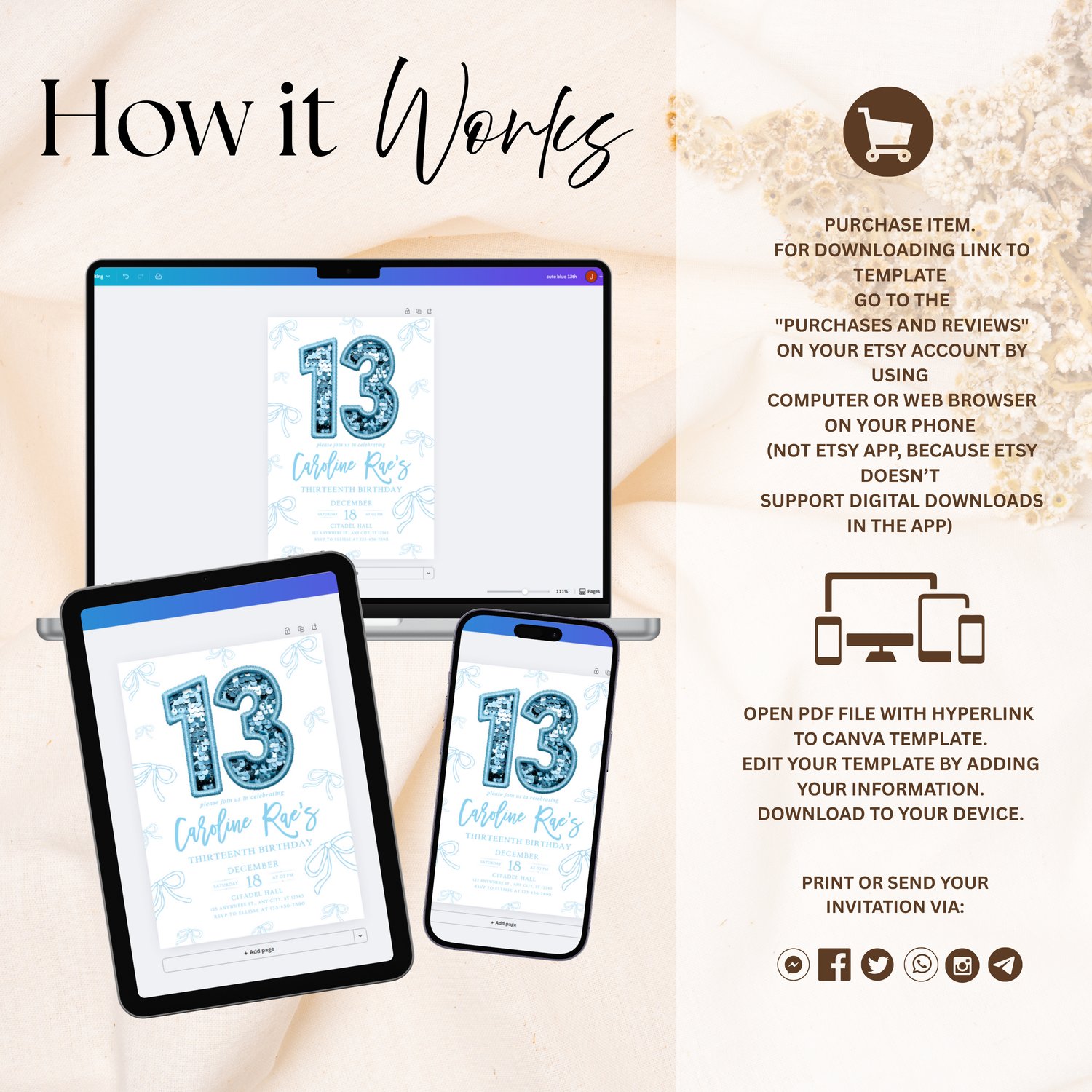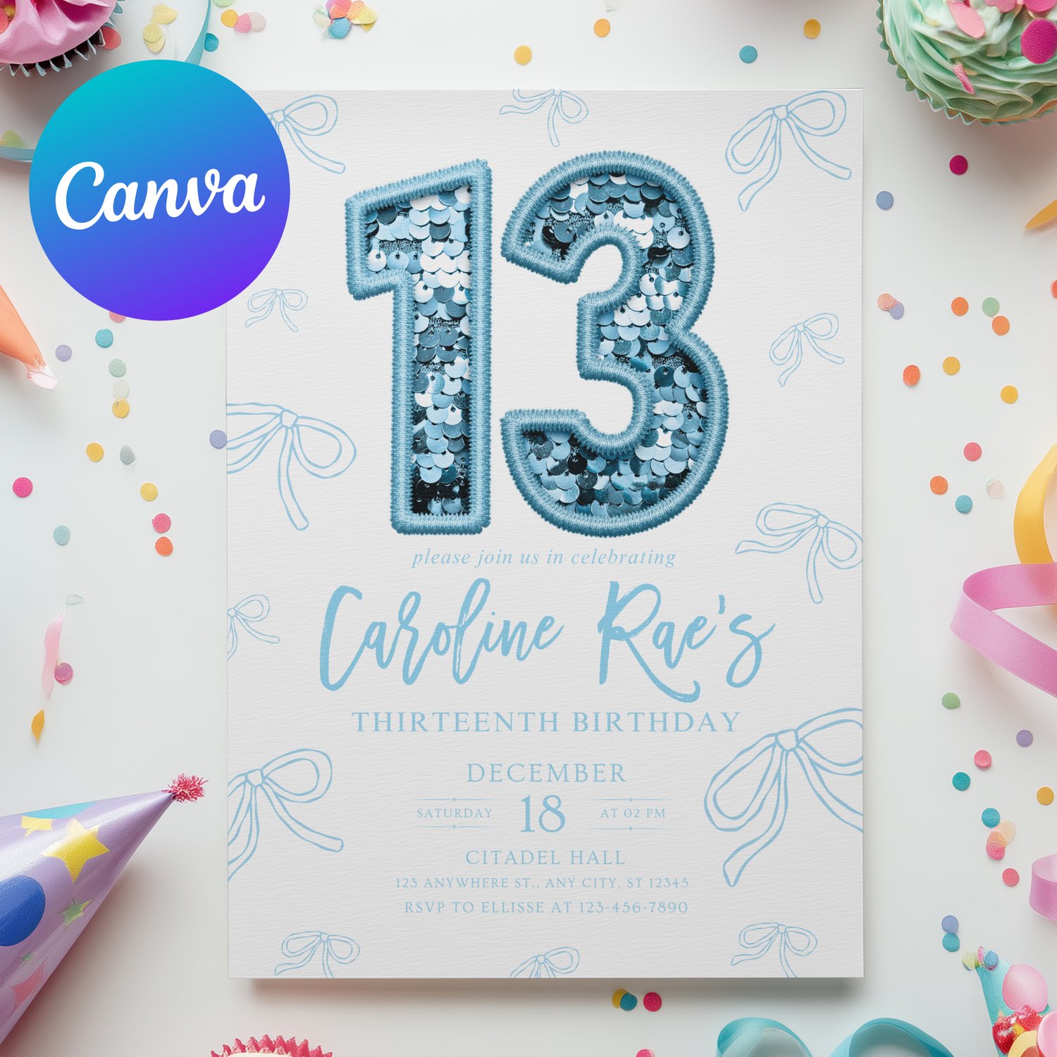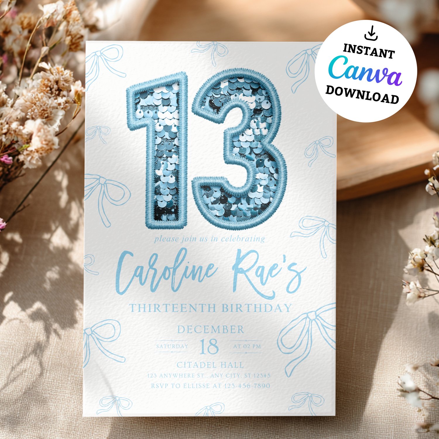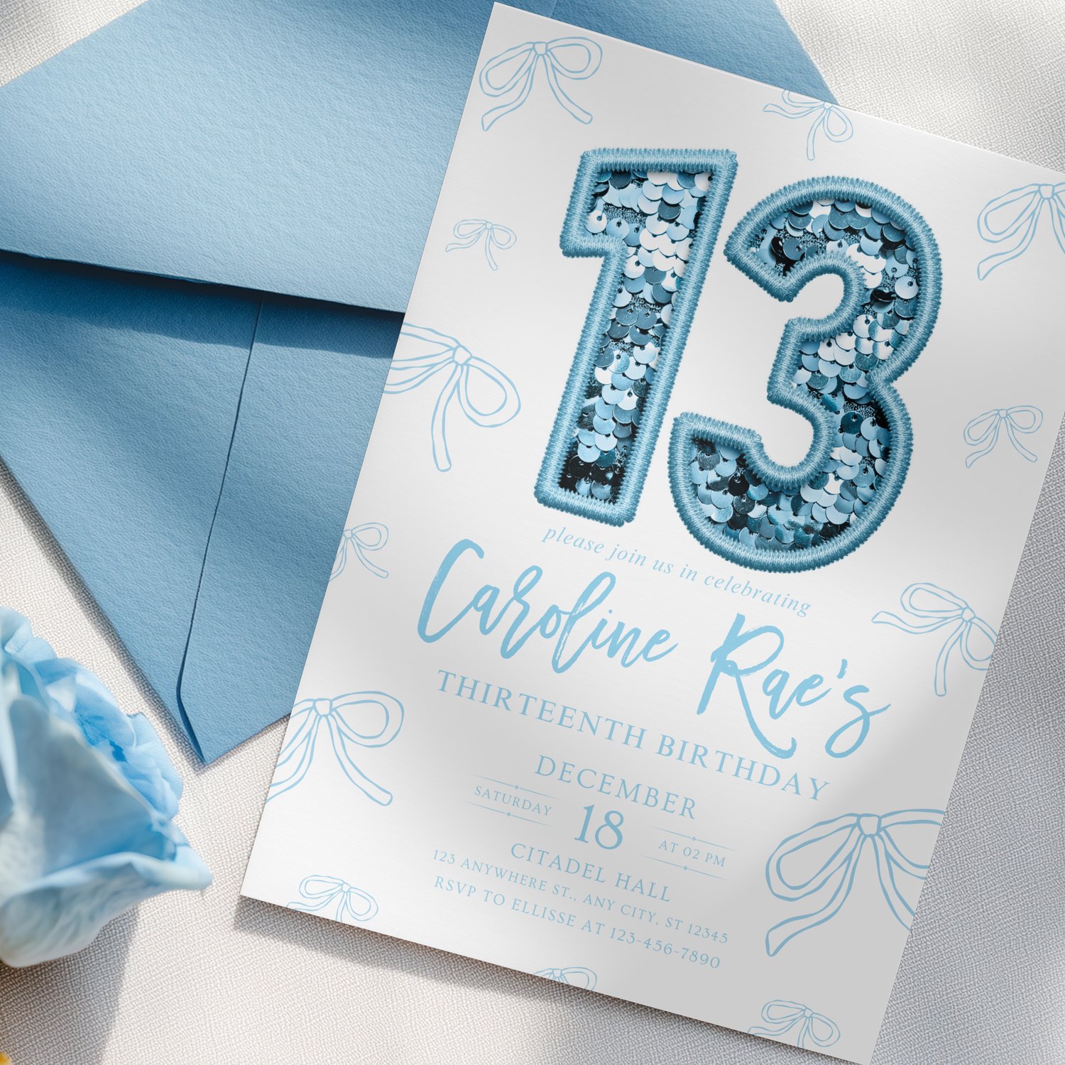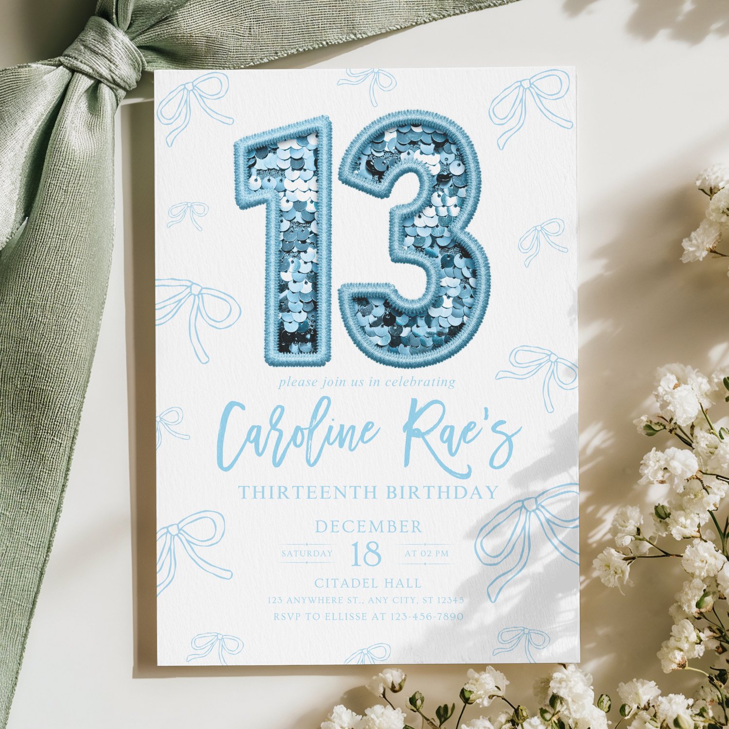 Coquette 13th Birthday Invitation Fancy Bow Birthday Invitation Sleepover Invitation Blue Coquette Bow 13th Birthday Girl Bow Invite