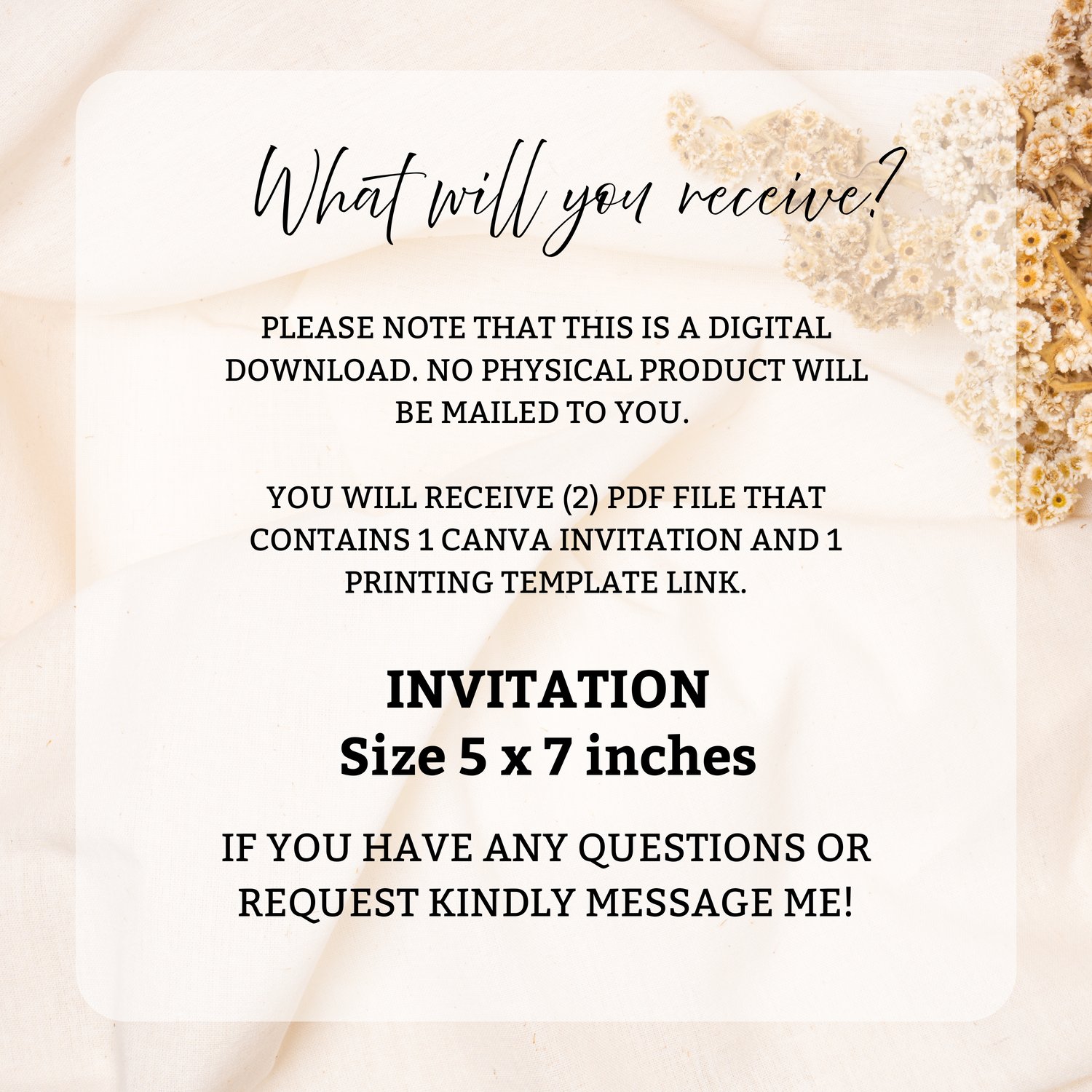This listing is for the creation and delivery of DIGITAL FILES for you to print yourself. NO PHYSICAL PRODUCT WILL BE SHIPPED Editable Invitation Canva Template • Lifetime Access This invitation is self-editable in CANVA App (Super Easy to use app on c