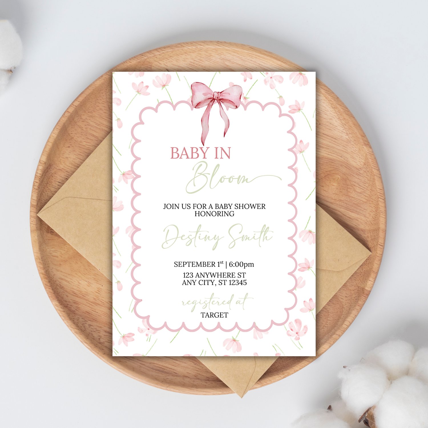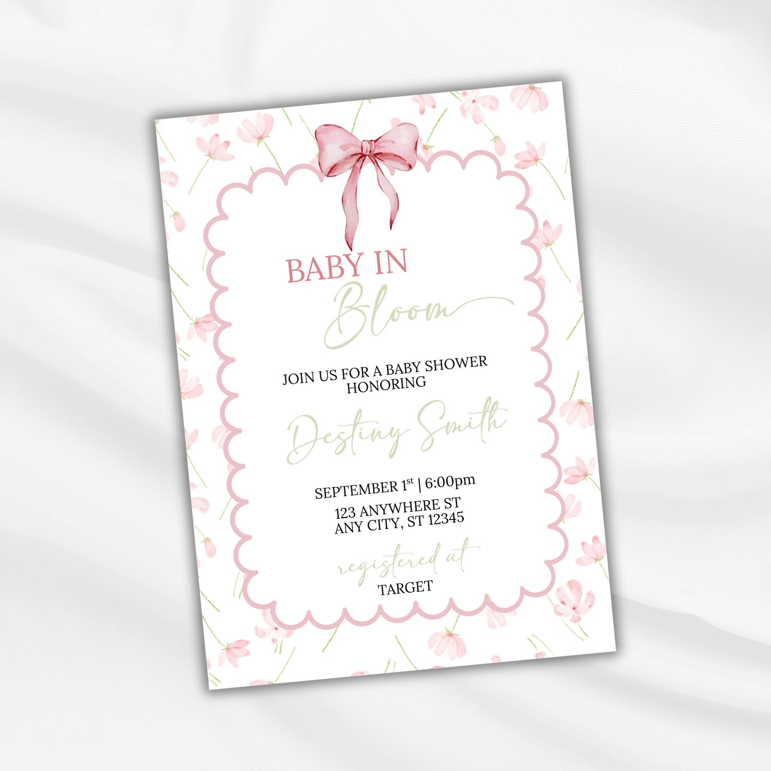Celebrate the upcoming arrival of your little one in style with our charming Baby in Bloom baby shower invitation! Featuring soft blush pink florals, a sweet watercolor bow, and elegant script fonts, this design is perfect for a spring or floral-themed celebration.