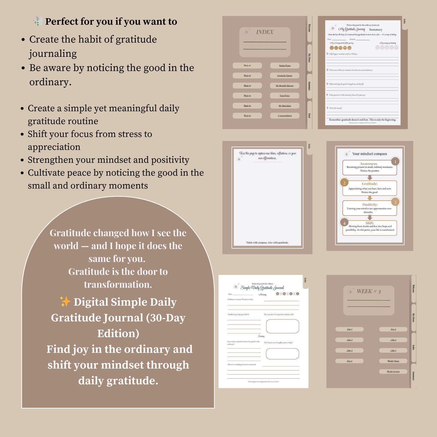 A gentle space to slow down, reflect, and reconnect with the good in your everyday life. This digital gratitude journal is designed with clean pages, easy navigation, and simple prompts that guide you toward a more mindful, peaceful mindset.