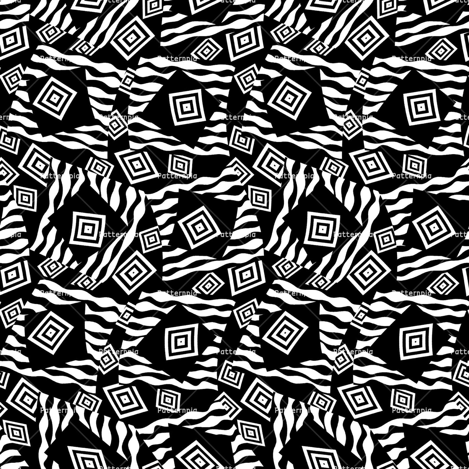 White concentric diamond squares interwoven with zebra-like wavy stripes on black base
