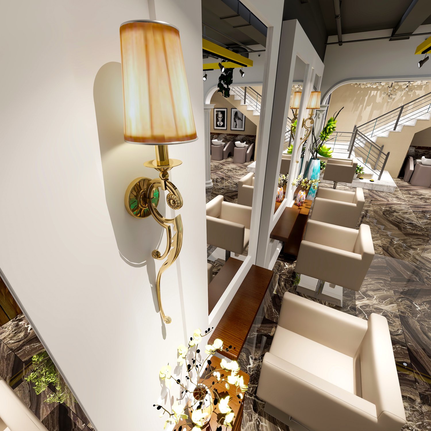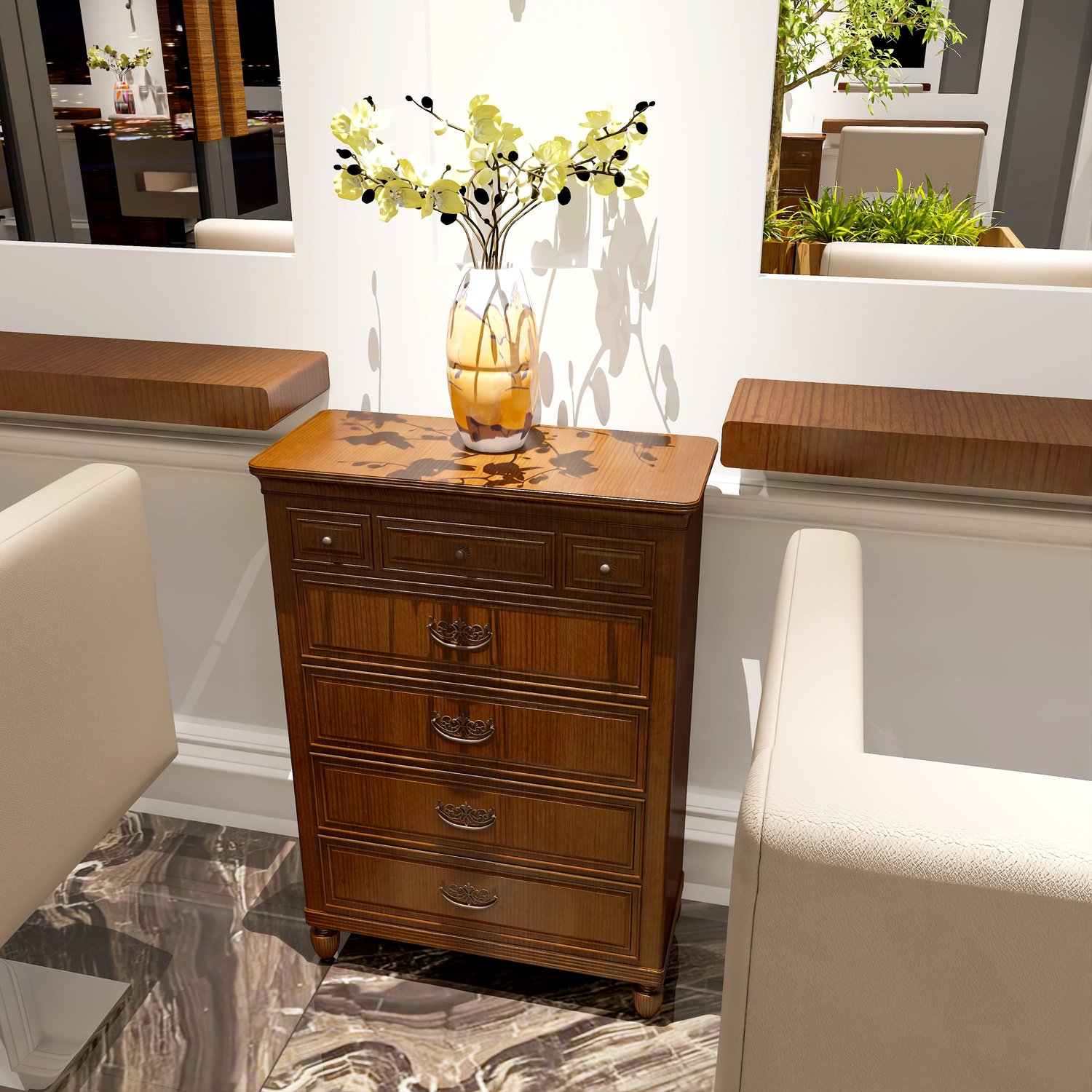 Add a glamorous touch to your 3d Hairdressing scene with this vanity set. Includes metallic mirrors and fabric materials.