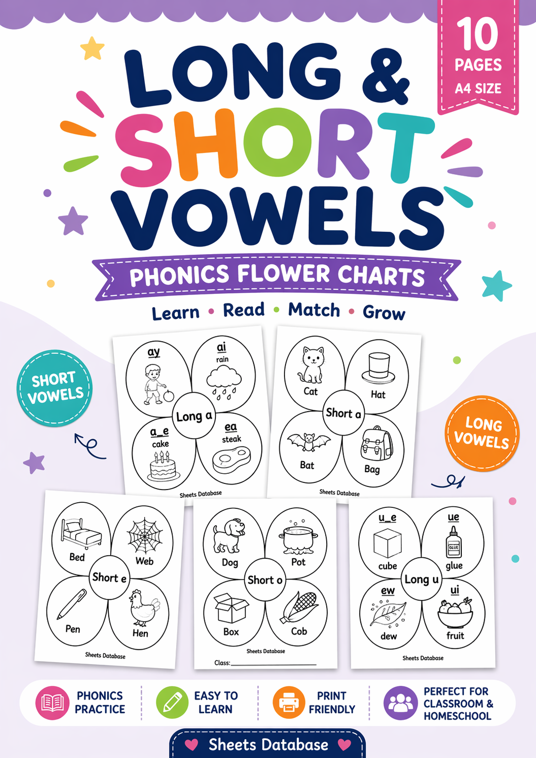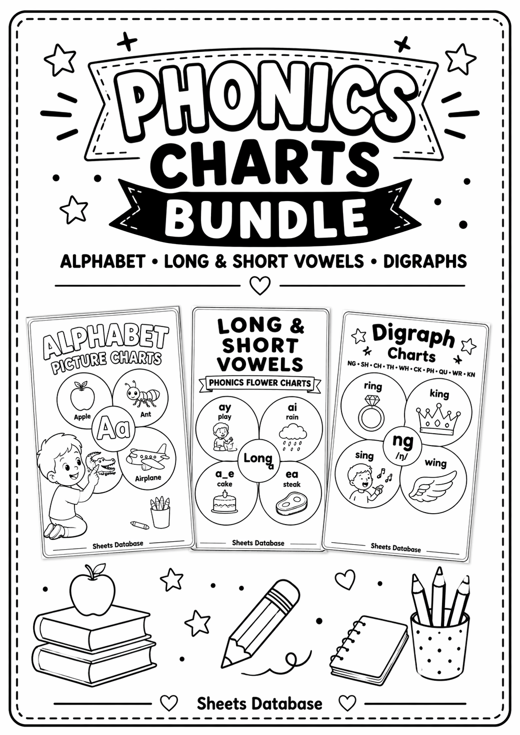 This bundle includes alphabet, vowel patterns, and digraphs, all presented in clear flower-style charts that are easy for children to recognize and remember.