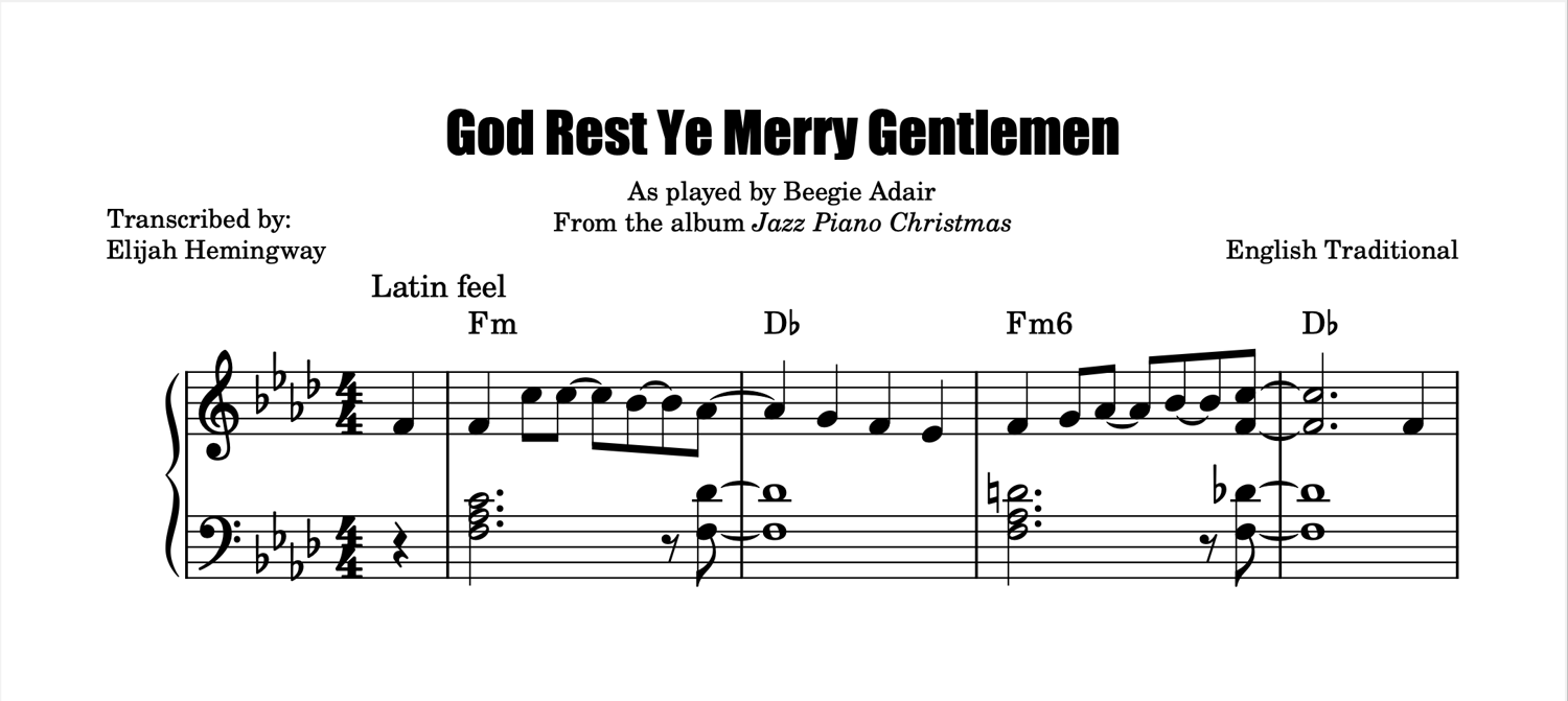 A transcription of God Rest Ye Merry Gentlemen as played by Beegie Adair.