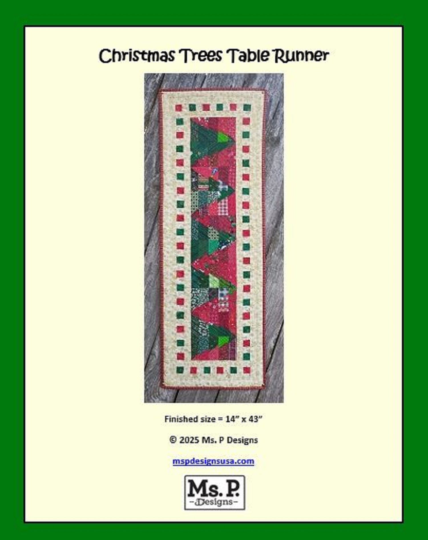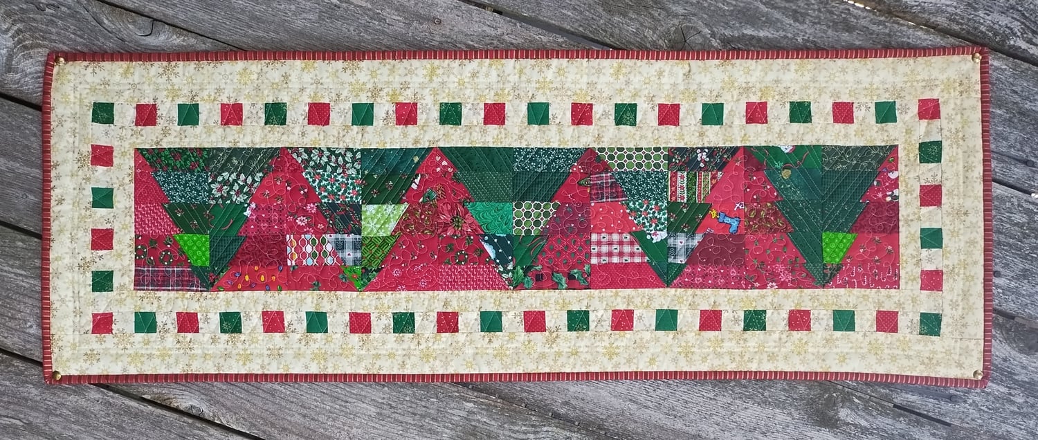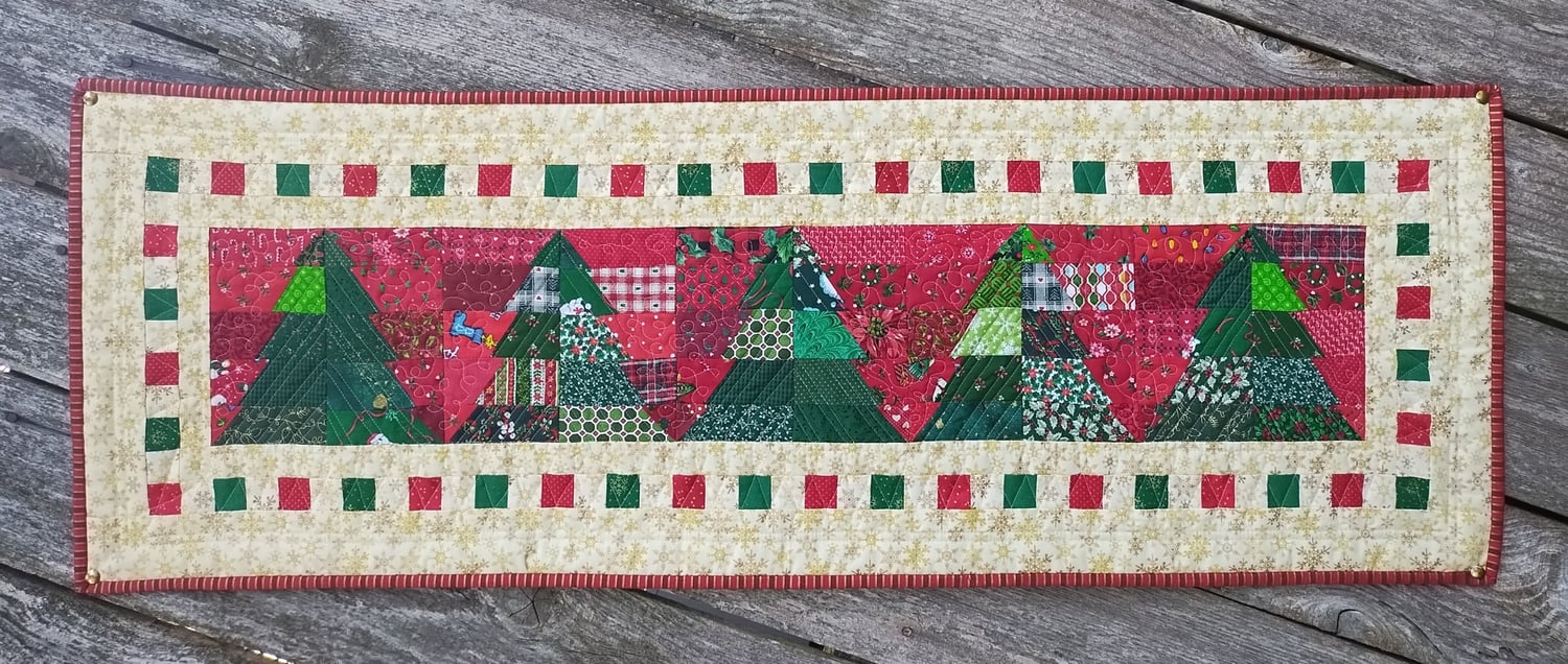Celebrate the season with a beautiful holiday table runner! This design features foundation paper pieced Christmas trees, with a pretty pieced border.