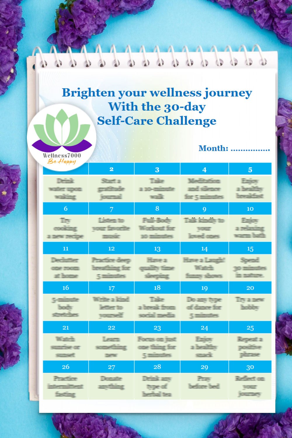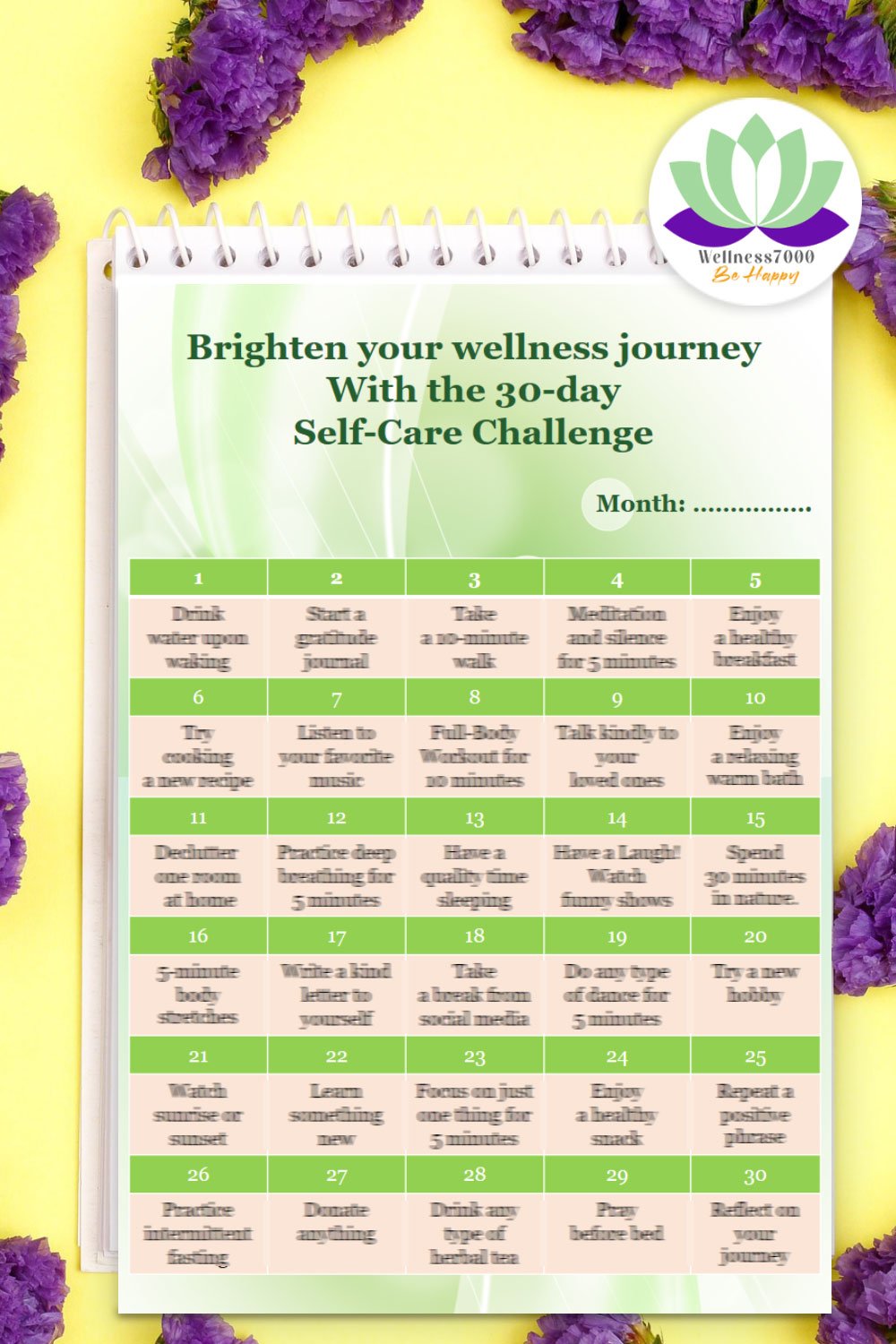 Each day, you will engage in a self care activity to help you boost your mood, improve your overall well-being and create some new habits.✨