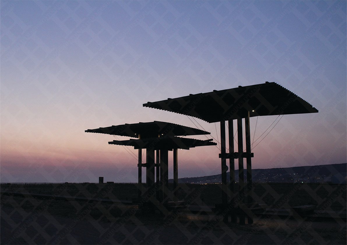 Geometric photograph of urban elements on a Portuguese beach. Taken in soft early evening light with a distant view of the hill and its villages.