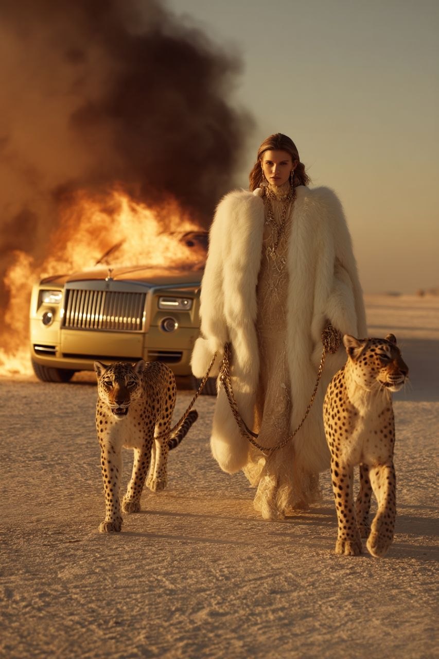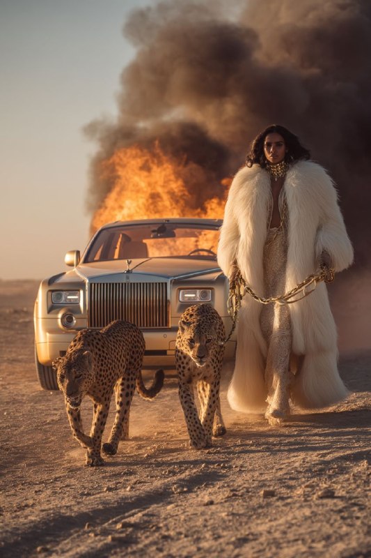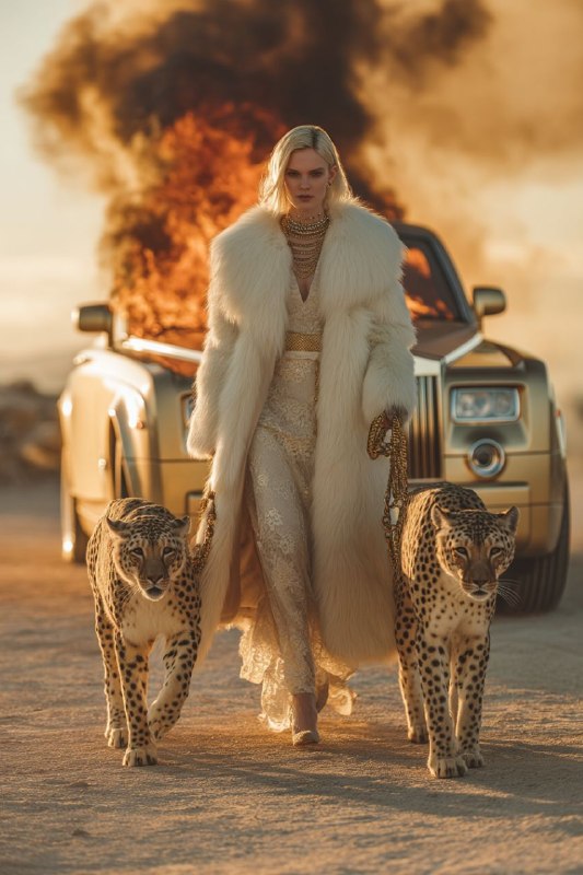Create a breathtaking high-fashion cinematic photograph! This prompt generates a luxurious woman in a white fur coat and gold accessories, confidently walking two cheetahs on gold leashes across a desert at sunset, with a burning golden Rolls-Royce blazing in the background. Perfect for fashion photographers, editorial creatives, and commercial art, delivering hyper-realistic 8K images, dramatic lighting, and epic wide-angle compositions. Keywords: high-fashion photography, cinematic desert scene, luxury editorial, hyper-realistic, dramatic imagery, cheetahs, Rolls-Royce, sunset photography.