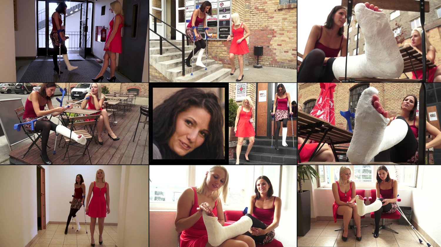 Poor Dee went to work today and stood on her single heeled Candie all day assuming it would be comfortable, but her unbalanced cast heel made it a torment. So, she called her roommate up and told her to meet her at lunch break in the park and bring a more comfortable sneaker for her. The clip opens as Dee gimps to the park and over to a bench where she finally can take her single shoe off and massage her aching casted toes hanging out of her cast. Just in time her roomie comes over with a sneaker, and she changes shoes while her friend tires on her single Candie and continues to provide her casted toes a relieving massage. When Dee gets up to go back to work her sneaker is more comfortable, but she is still walking on an unbalanced heel and only five of her toes are sticking out. She is also self-conscious waking around and carrying just her single heel. One of our earlier classic works just published now. This is the Director's Cut.