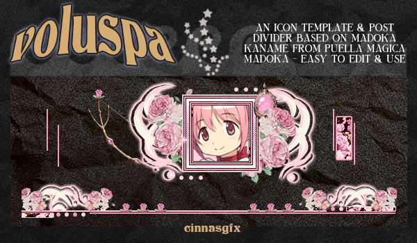 An icon template & post divider based on Madoka Kaname from Puella Magi Magica Madoka, as requested by mayoinomori on tumblr. There are a few blockquotes on this template while being wide enough to cover the post width. The image used in the preview is not included with the psd file. Easy to edit if you're familiar with the following: smart objects, layer styles and layer masks.