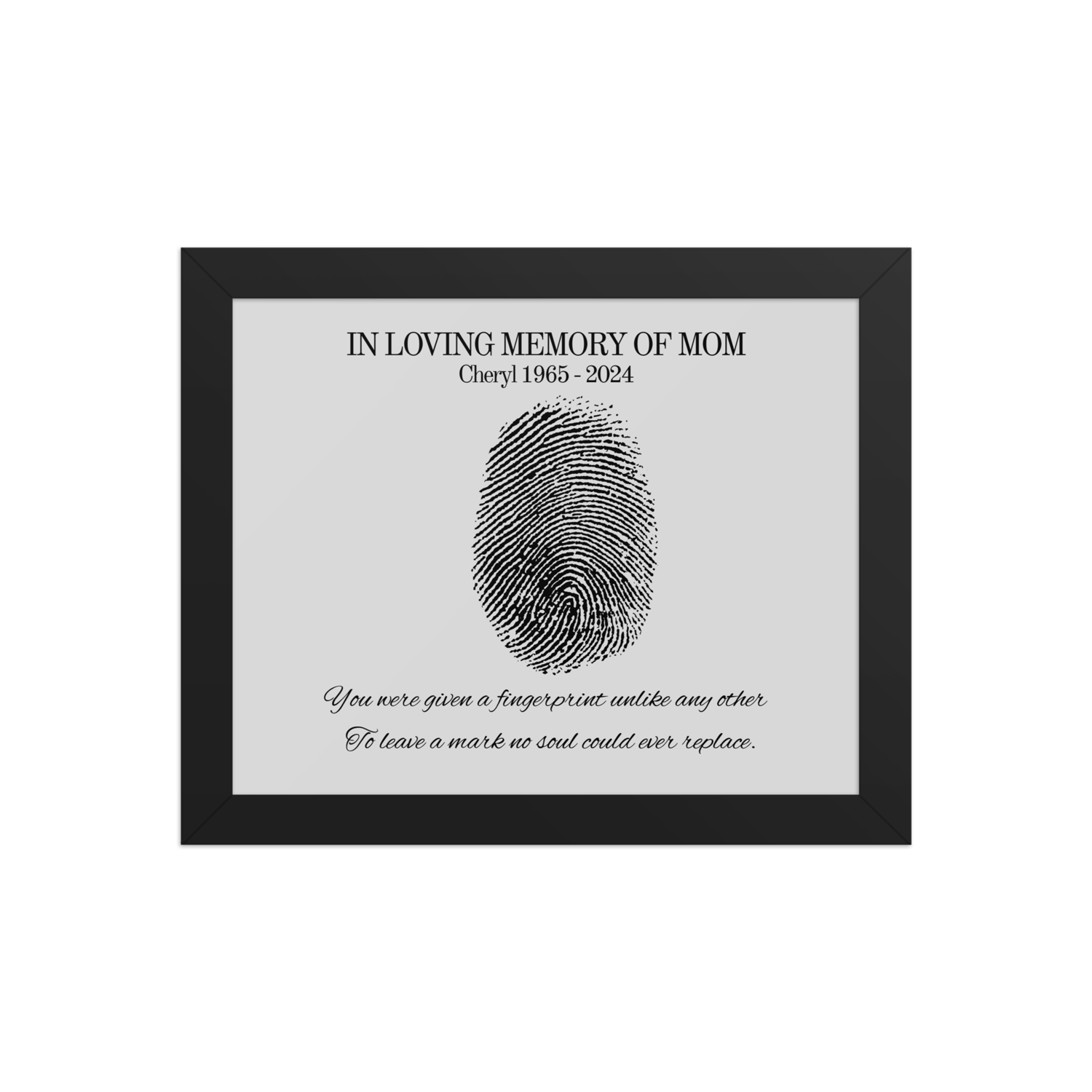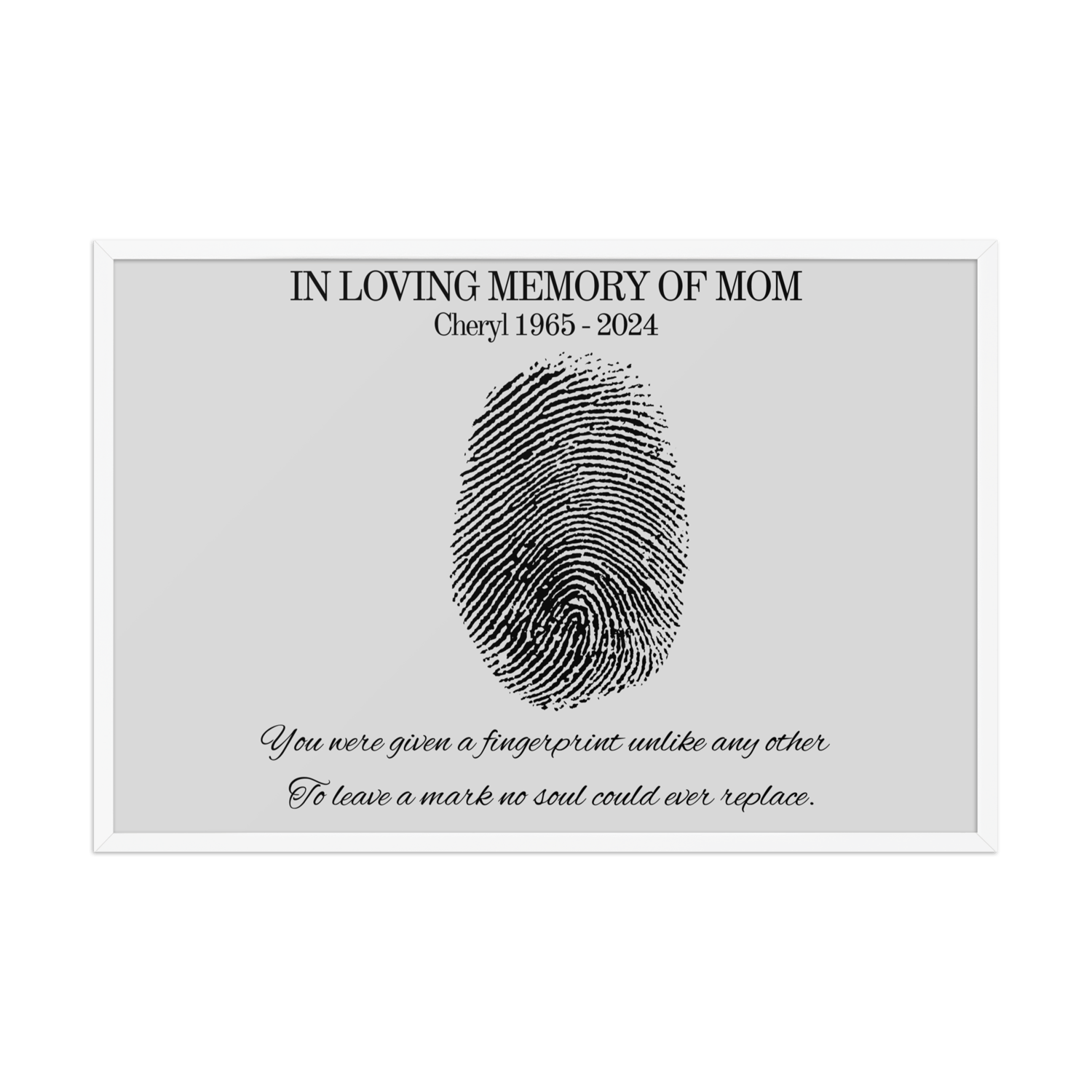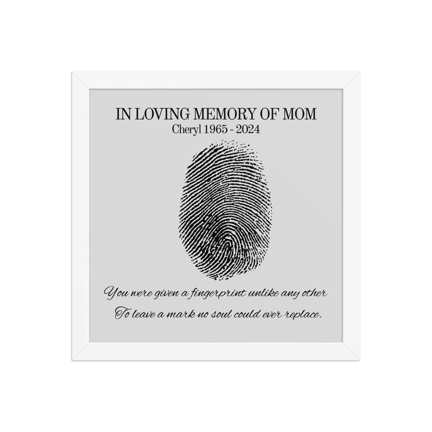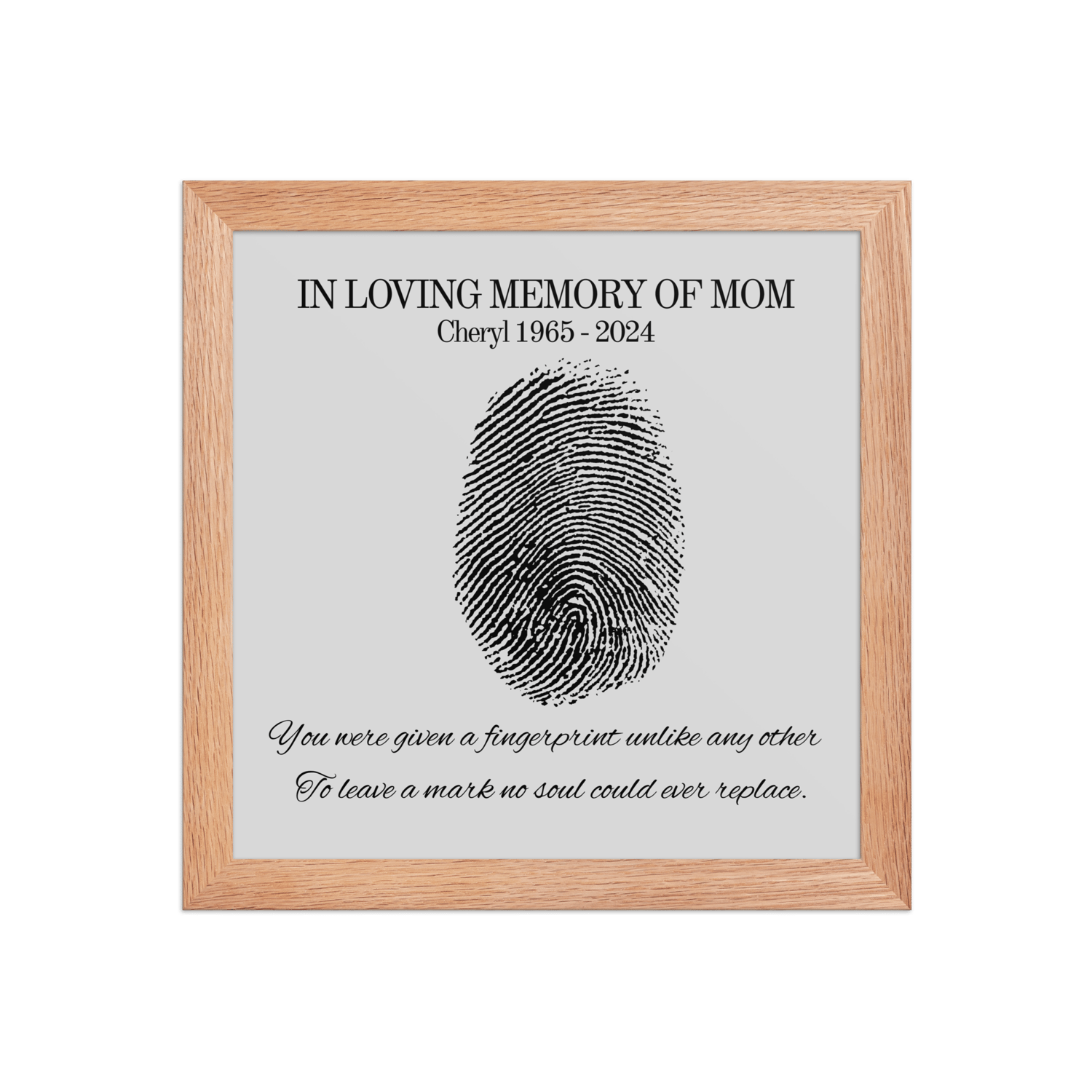 Designed to bring comfort during grief, this custom design features your loved one’s name and dates beneath a fingerprint illustration — a powerful symbol of their unique impact on your life.