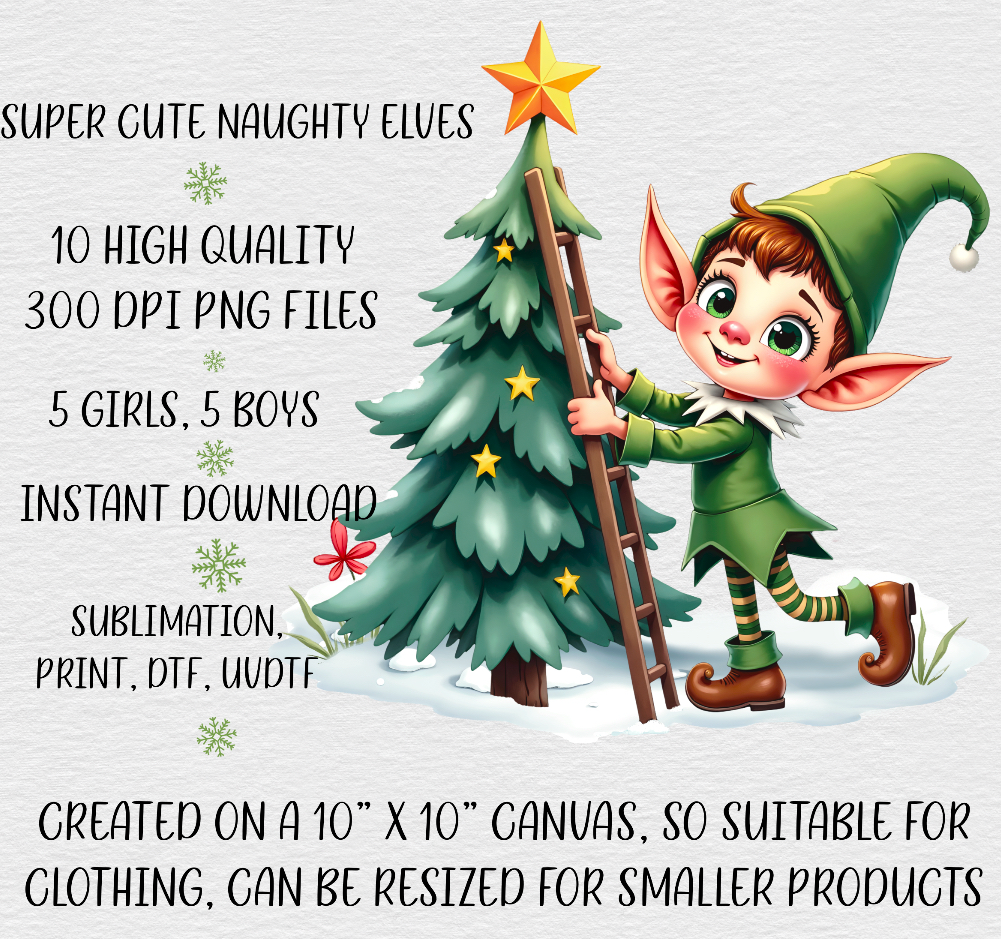 Cute naughty Elves. 5 adorable boys & 5 adorable girls. 10 PNGs. Instant download. Sublimation, print, DTF, UVDTF. Christmas design.