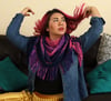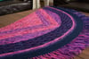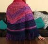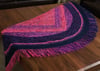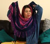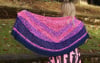 This shawl was inspired by Jem and the Holograms! I was highly motivated by how geometric shapes were very popular during the 80s and used that to work a triangular shawl that becomes a half circle shawl partway through! In addition, the general motifs found in the shawl are all “lightning bolt” reminiscent or angular, as well.