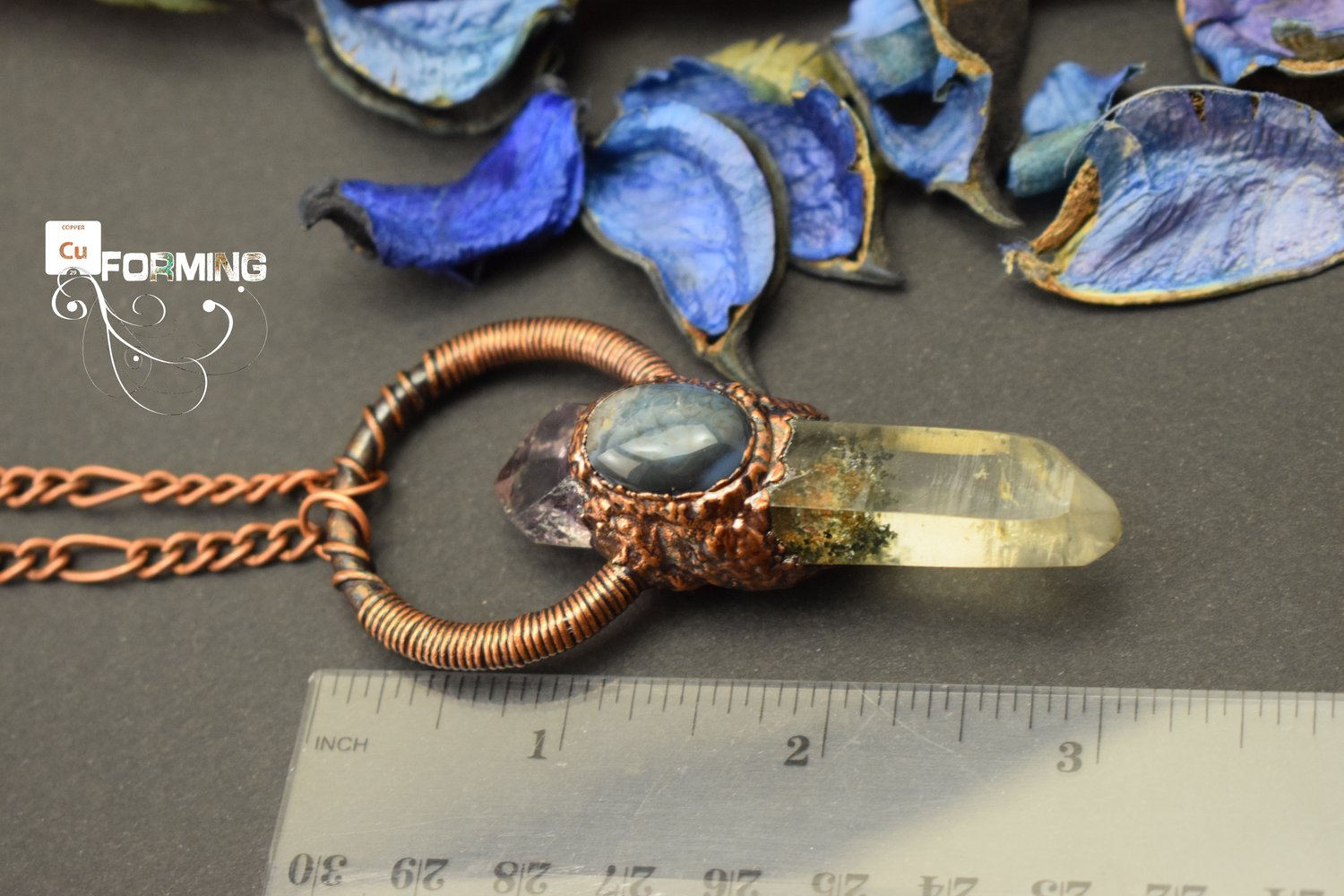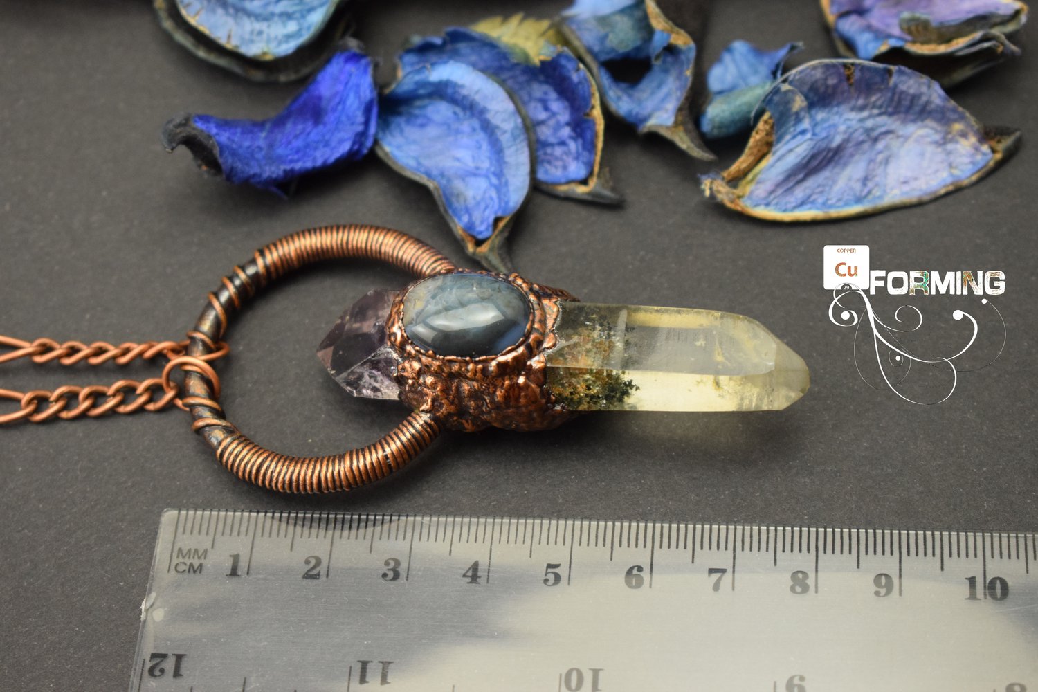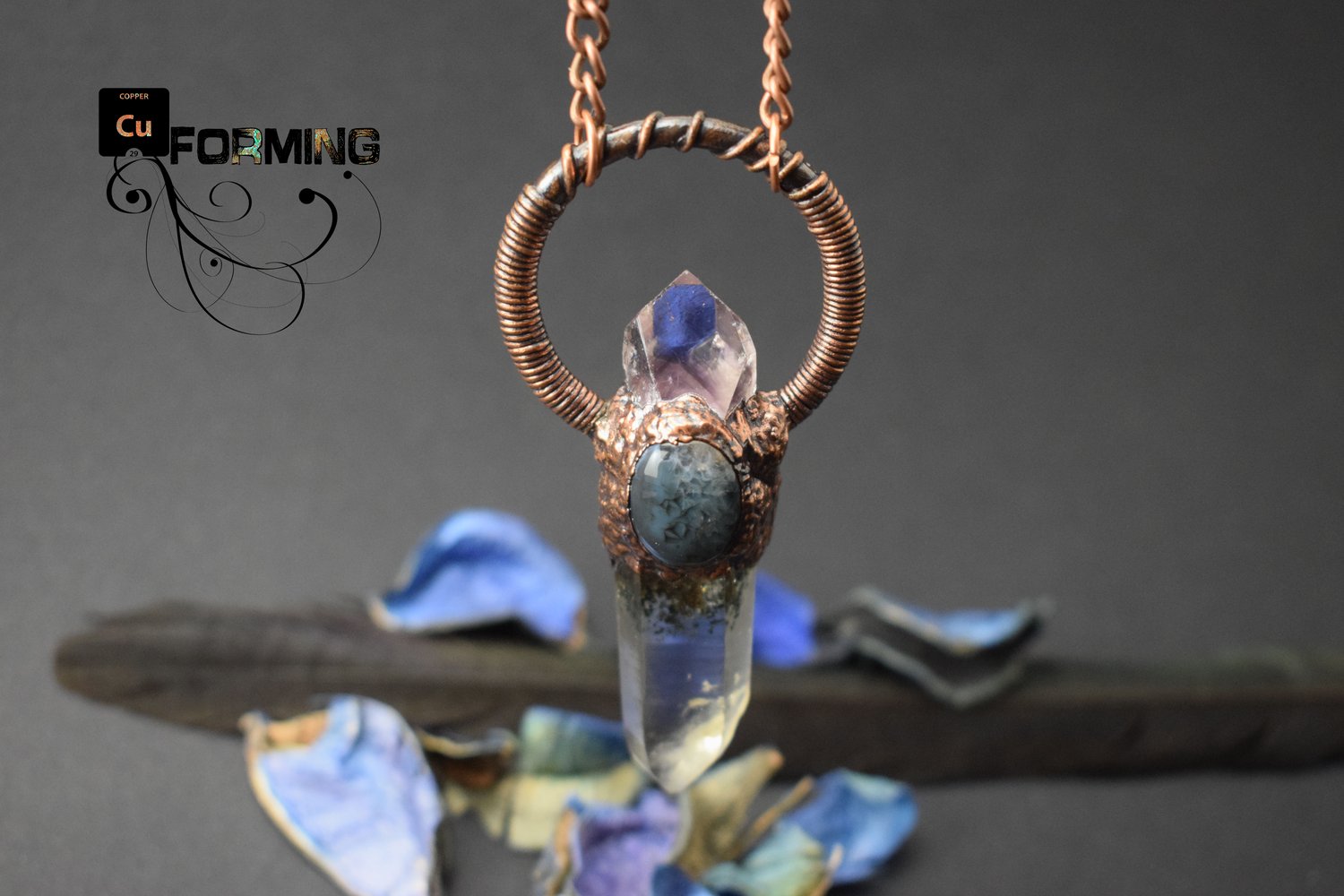I personally electroformed this pendant with copper in my lab. ✩ I checked all the details to achieve the perfect quality you deserve. On a copper hoop, I installed a clear quartz crystal point and a phantom amethyst crystal on the top, and I then adorned all with a blue agate cabochon. Copper is colored with a dark patina and protected with a lacquer specific for metal jewelry.