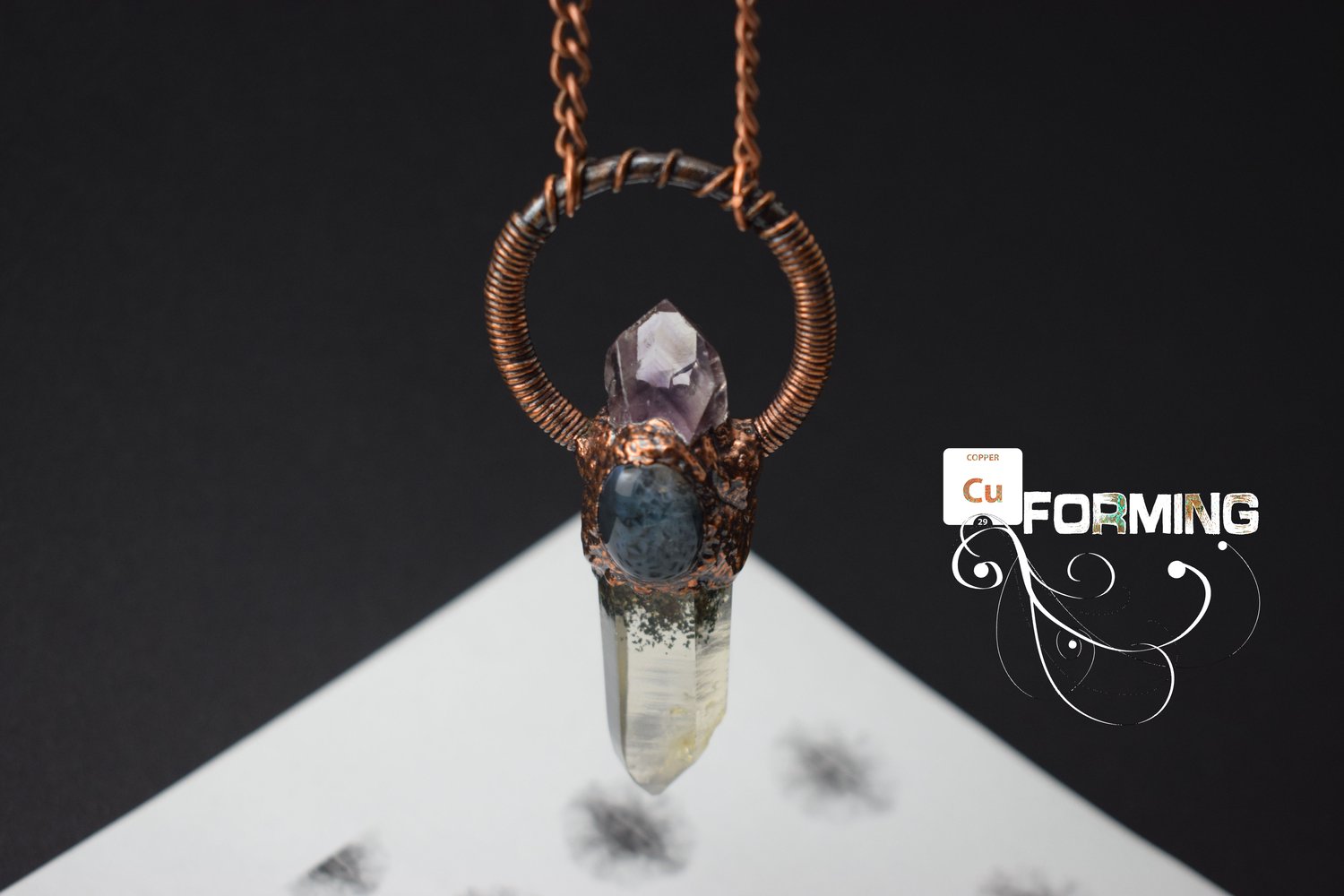Copper electroformed Pendant Quartz crystal and Phantom Amethyst