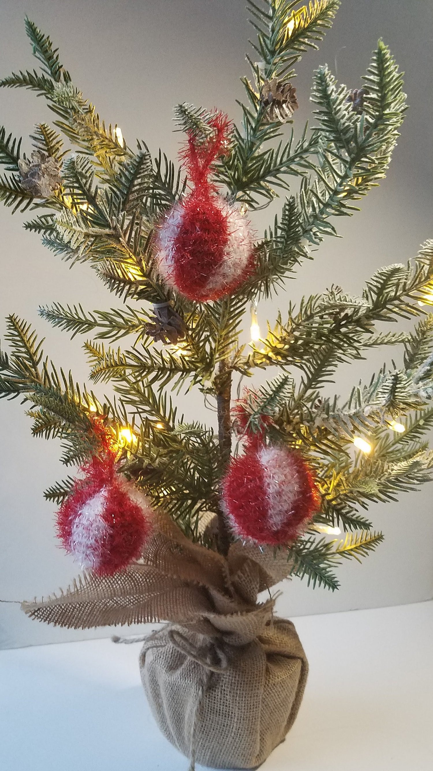 Let’s celebrate the holidays with making fun Christmas tree ornaments! This project is a little funny because it’s trying to add summer vibes to Christmas tree. Red Heart Scrubby Sparkle yarn is meant for dishcloths and scrubbies mostly but the sparkly textured yarn makes fun and festive Christmas tree ornaments as well.