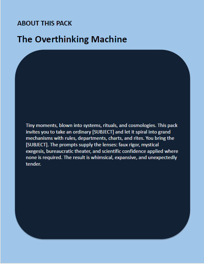 The Overthinking Machine is a prompt pack for turning ordinary things into absurdly detailed systems—departments, rules, rituals, flowcharts, philosophies, and tiny bureaucratic universes.