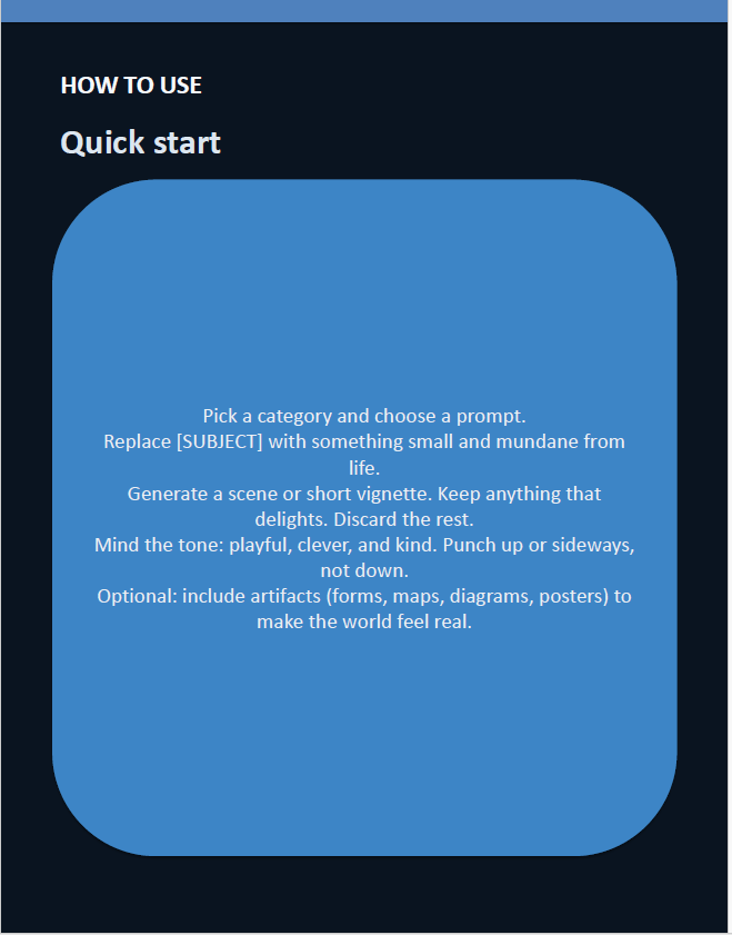 Keywords: overthinking prompts, worldbuilding prompts, satire writing prompts, AI prompt pack, writing prompts PDF, RPG GM tools, lore generator, faction generator, bureaucracy prompts, story toolkit