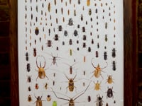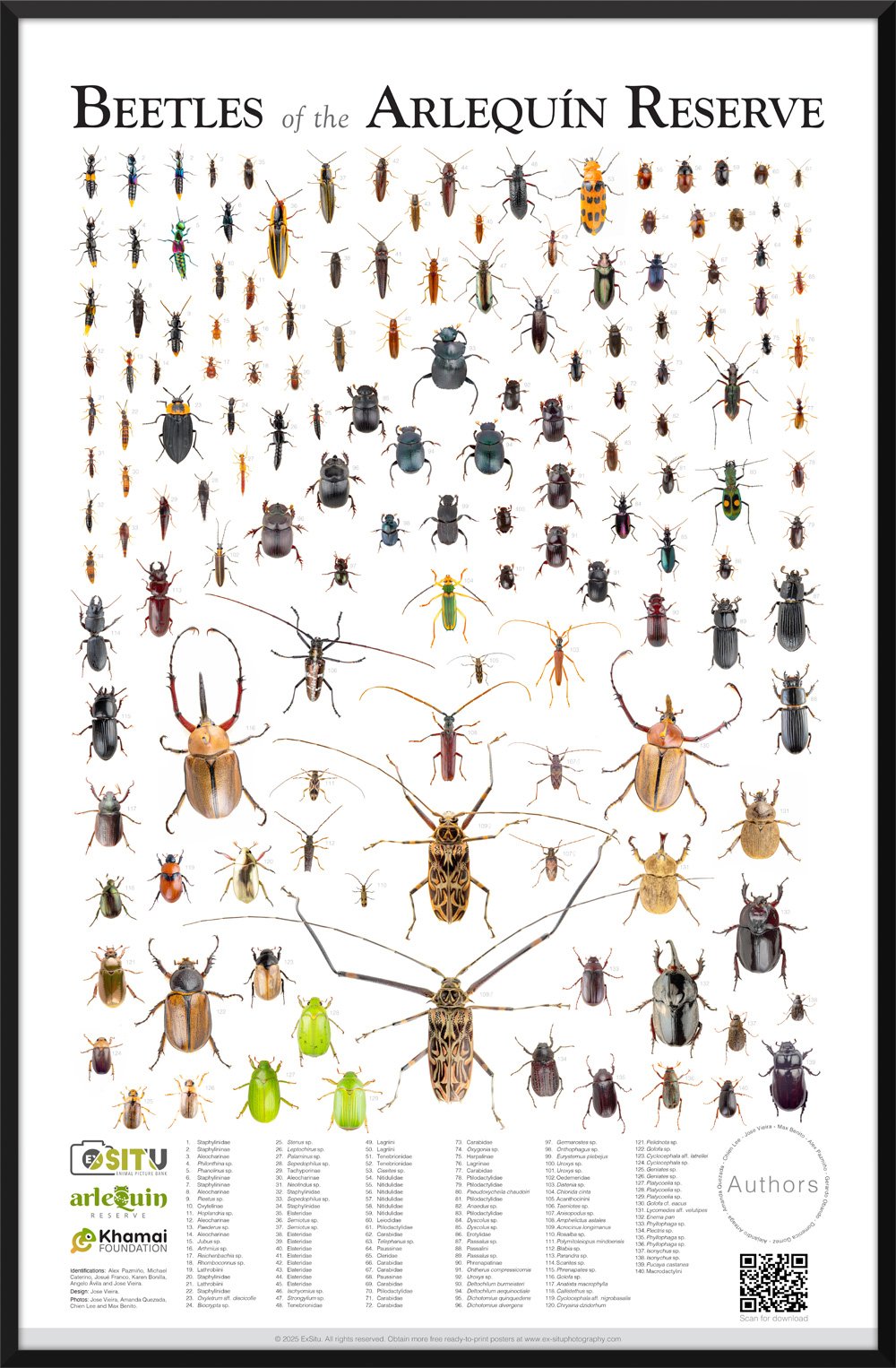 This 70x106 cm scientific photographic poster showcases 140 species of beetles found at the Arlequín Reserve in the Mindo cloud forest of Ecuador. The artwork is printed on photographic paper and comes in an Ashford satin black frame with a clear acrylic cover.