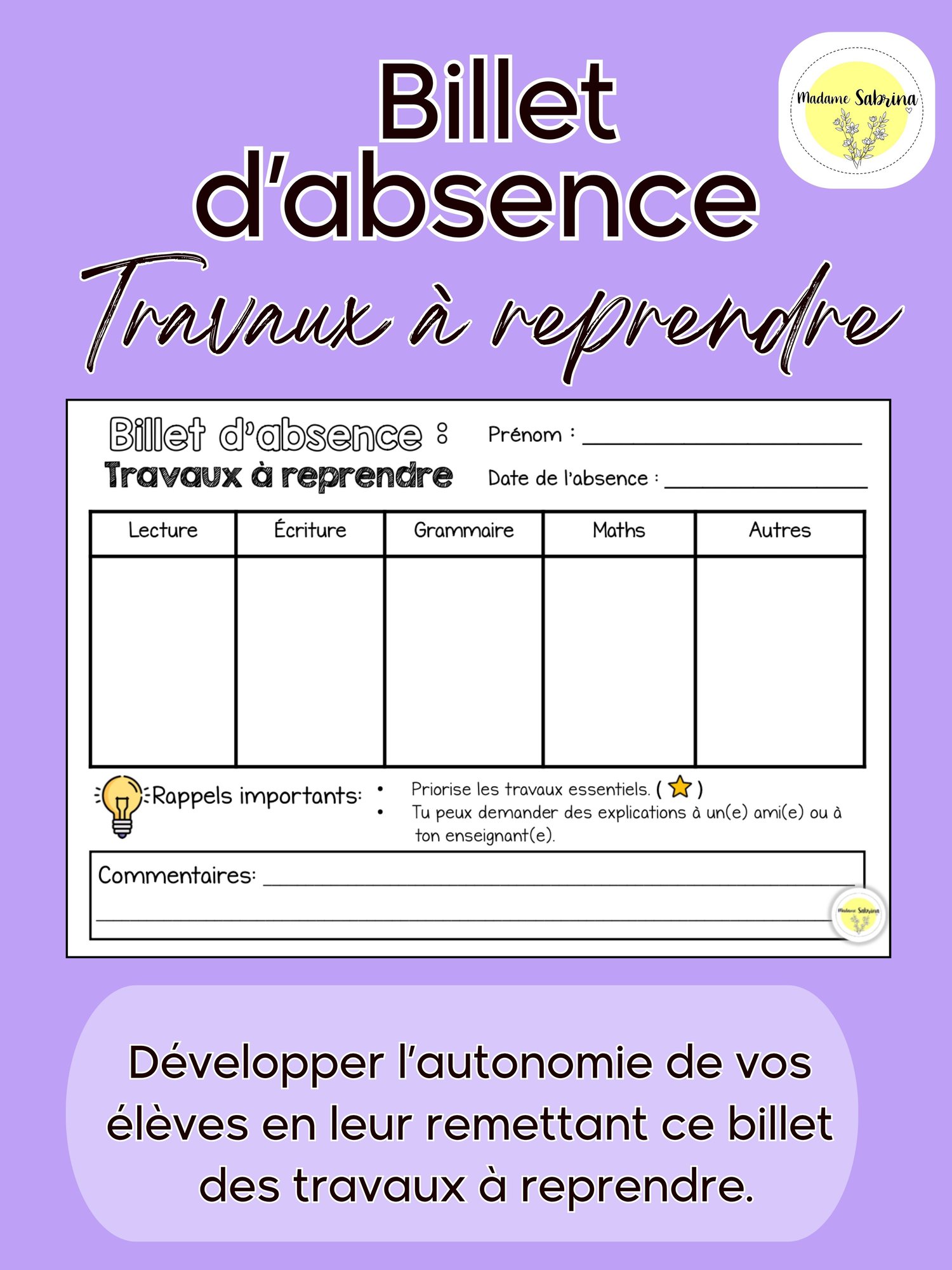 Ce billet vous permet de noter rapidement les travaux à compléter, tout en aidant vos élèves à s’organiser et à devenir plus autonomes.
