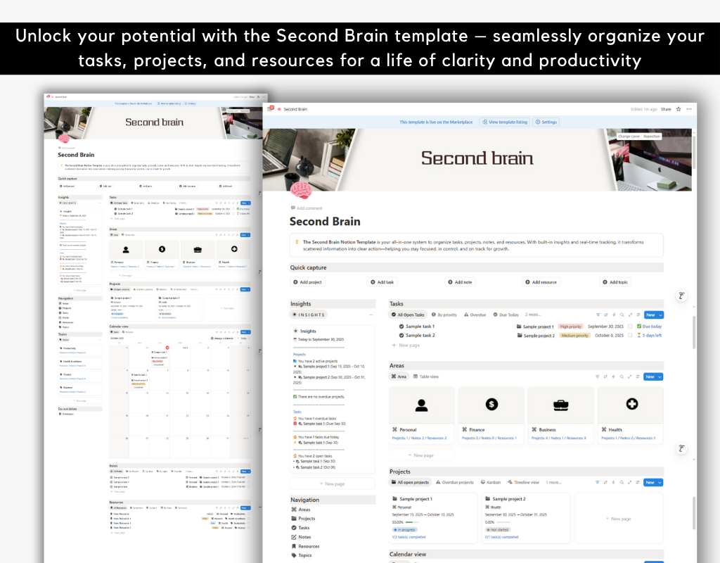 The Second Brain Notion Template is your all-in-one operating system to capture, organize, and act on everything that matters. Instead of drowning in scattered notes, forgotten ideas, and endless to-dos, you’ll have a system built for clarity, focus, and growth.