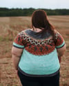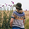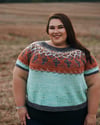 Rattlesnake features a top-down seamless construction with a somewhat slouchy fit. Optional waist shaping is included. With a colorwork yoke and DK weight yarn, the tee is warm and suitable year-round, but it might be best to wear at night during the hot summer months.