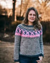 Intended to fit with 2-4 in/5-10 cm of positive ease. Sample pictured is size 3 on a 37 in/94 cm bust with 2.5 in/6 cm of positive ease. For more sizing info, see Schematic aboveColorwork and stockinette: 21 sts and 26 rnds = 4 in/10 cm on main Colorwork and stockinette: 21 sts and 26 rnds = 4 in/10 cm on main needles