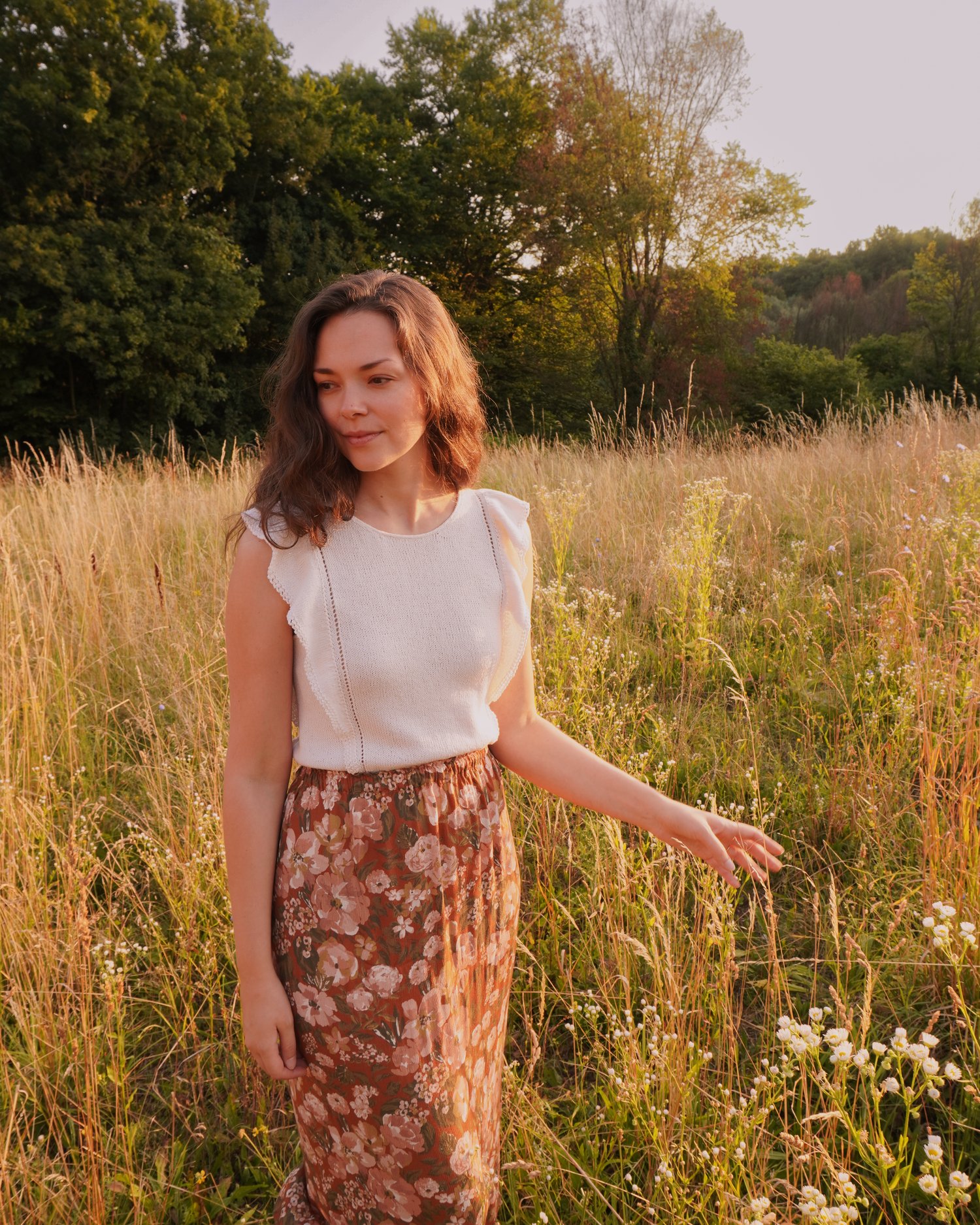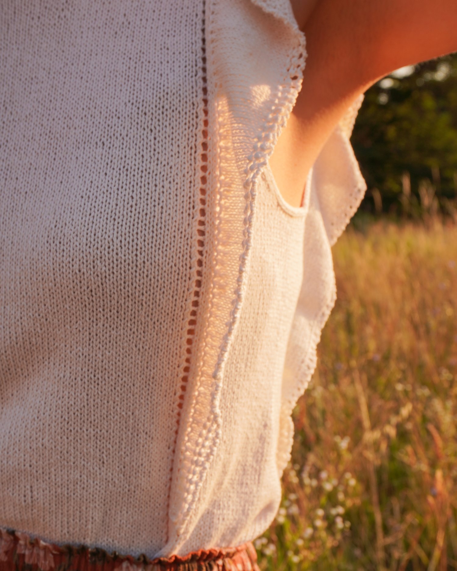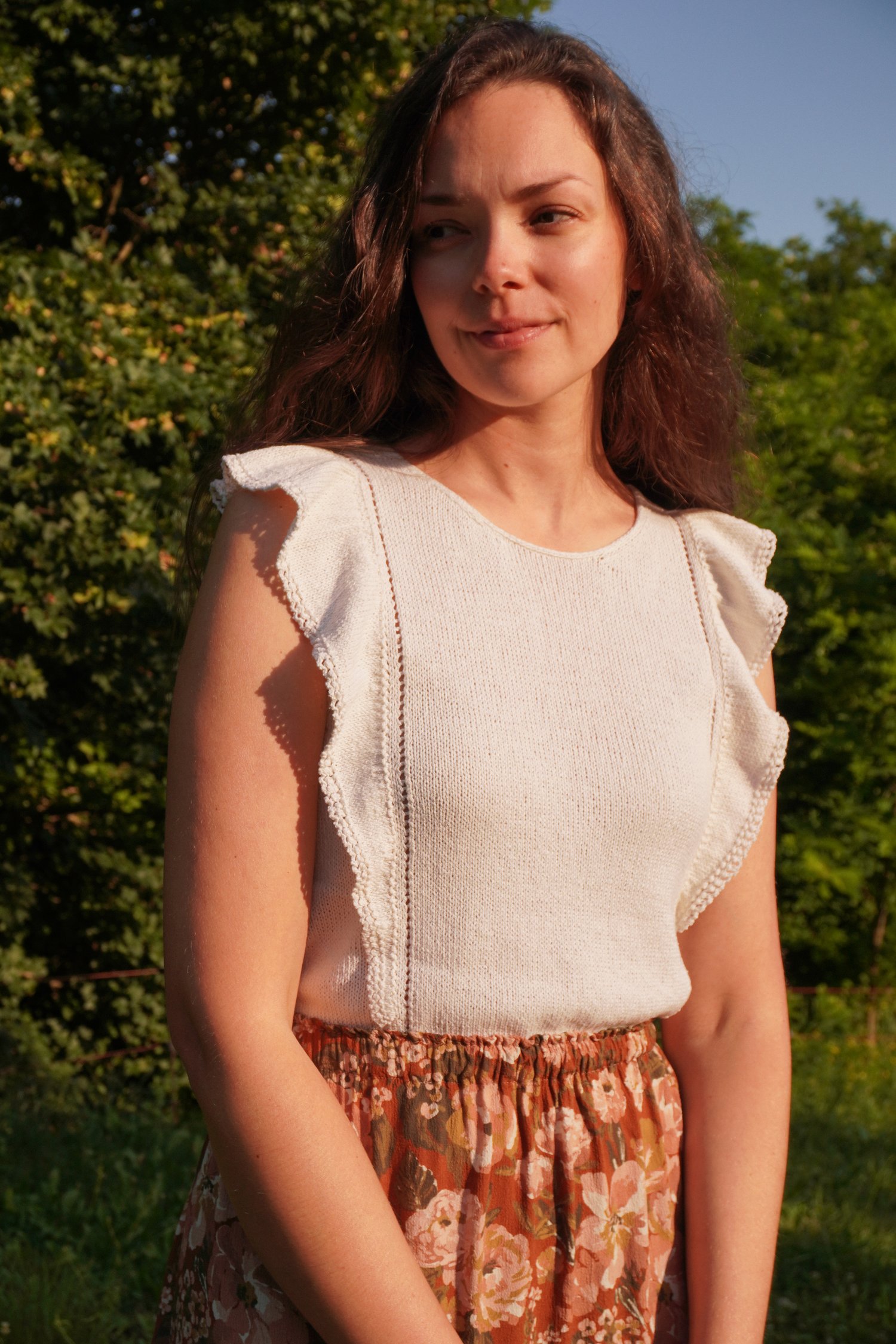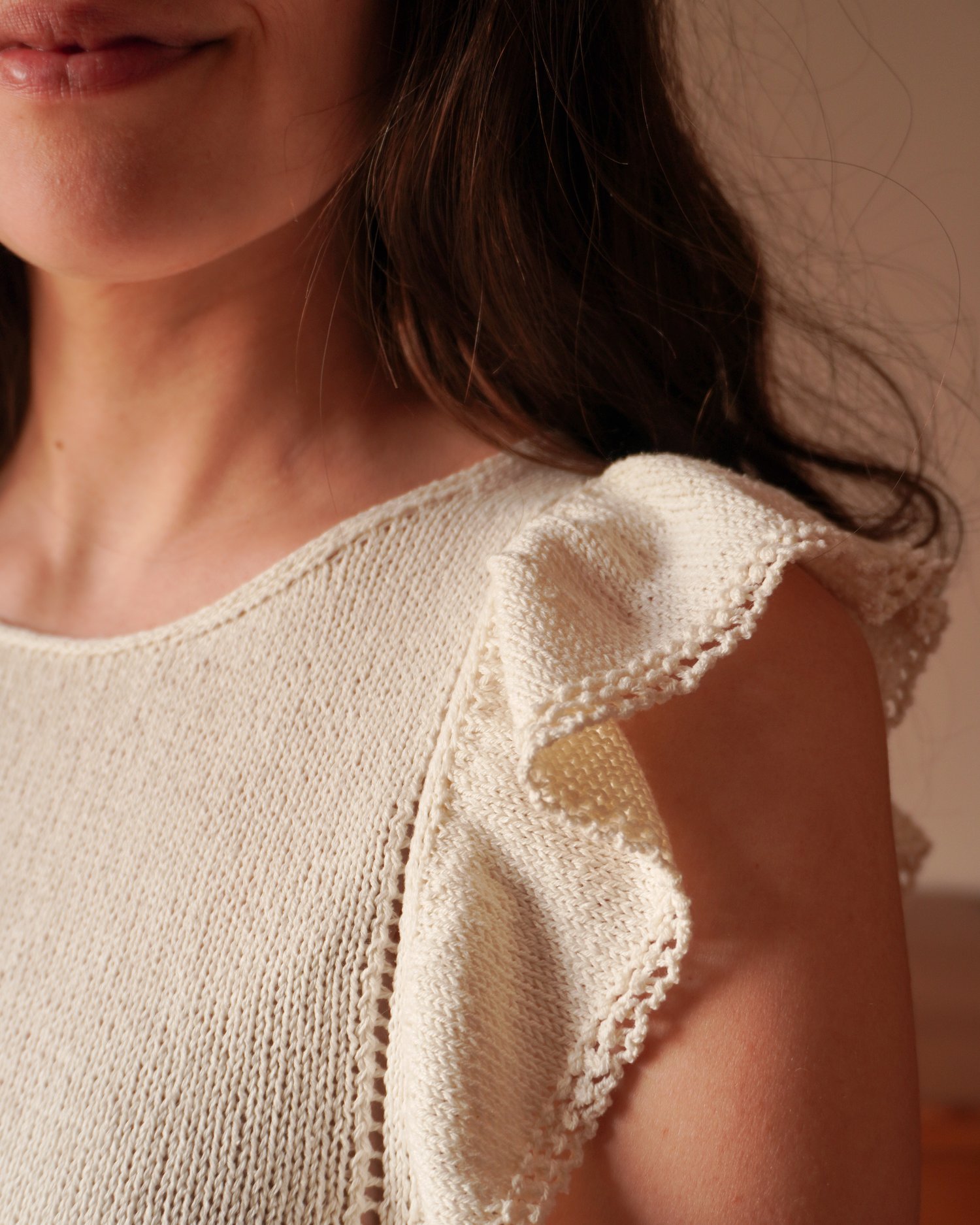 The Floret Top is worked seamlessly from the top down. The back is first worked by knitting back and forth, then stitches are picked up to work the front. The back and front panels are then joined to work the body in the round. All edges on the body are finished with I-cords and stitches are picked up along the eyelet columns on the body to work the shoulder ruffles with short row shaping.