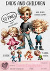 Father, Dad, children. Cartoon style. 58 PNGs + 2 FREE backgrounds. Incl various clipart. 3 Dads, 4 girls, 4 boys. Sublimation, print. Please ensure you are confident in the use of clipart before purchasing. No text. See pics for what is included, No physical products supplied.