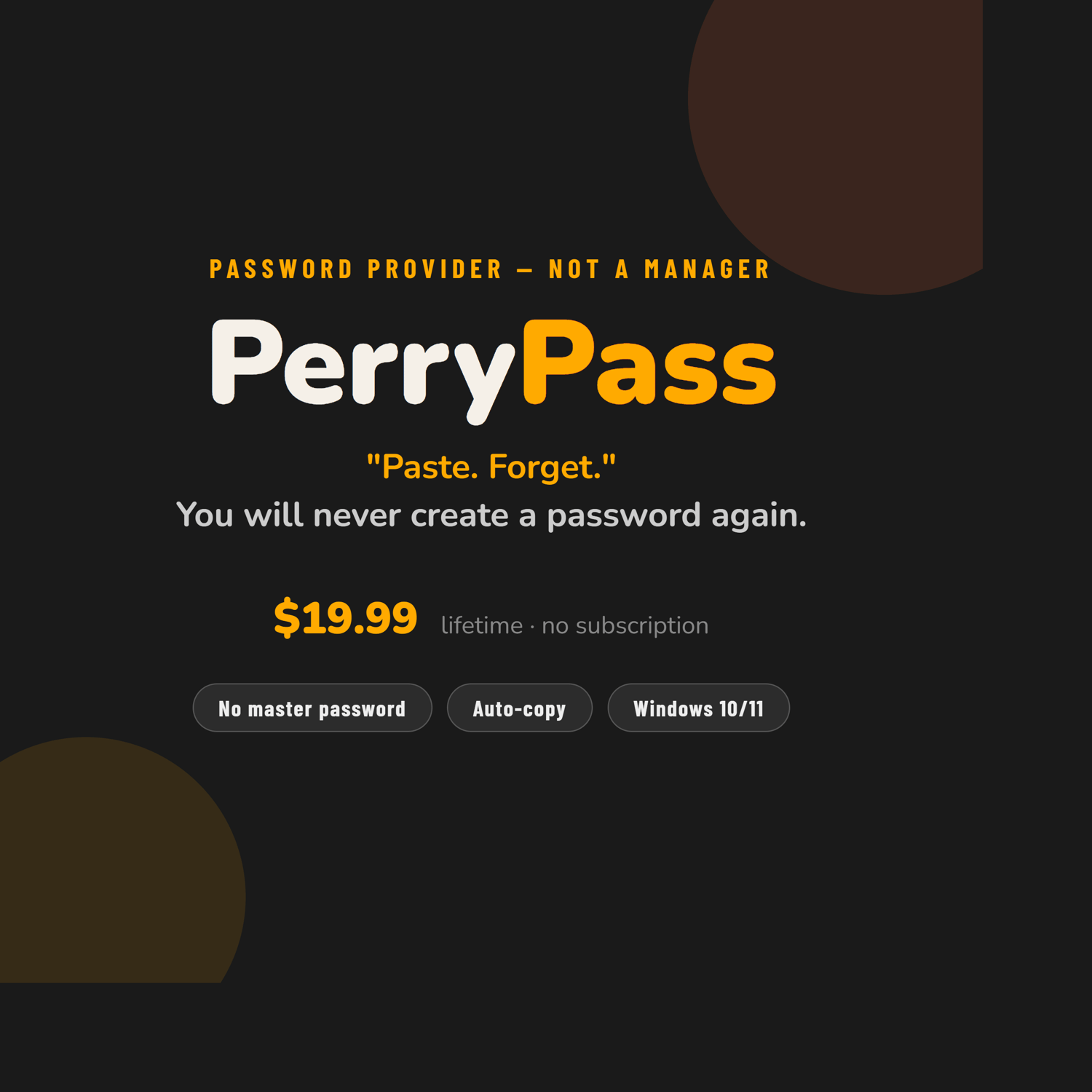 Every password you will ever need — from this moment forward — is assigned by PerryPass. You never type one, choose one, or think one up. Ever again. We are not a manager. We are a provider. We assign. You paste. Done.