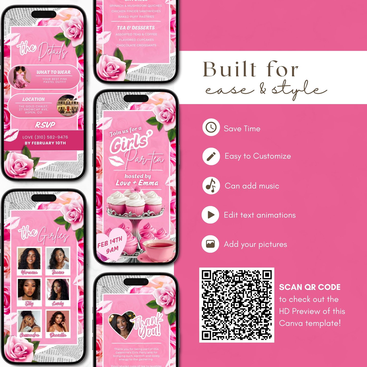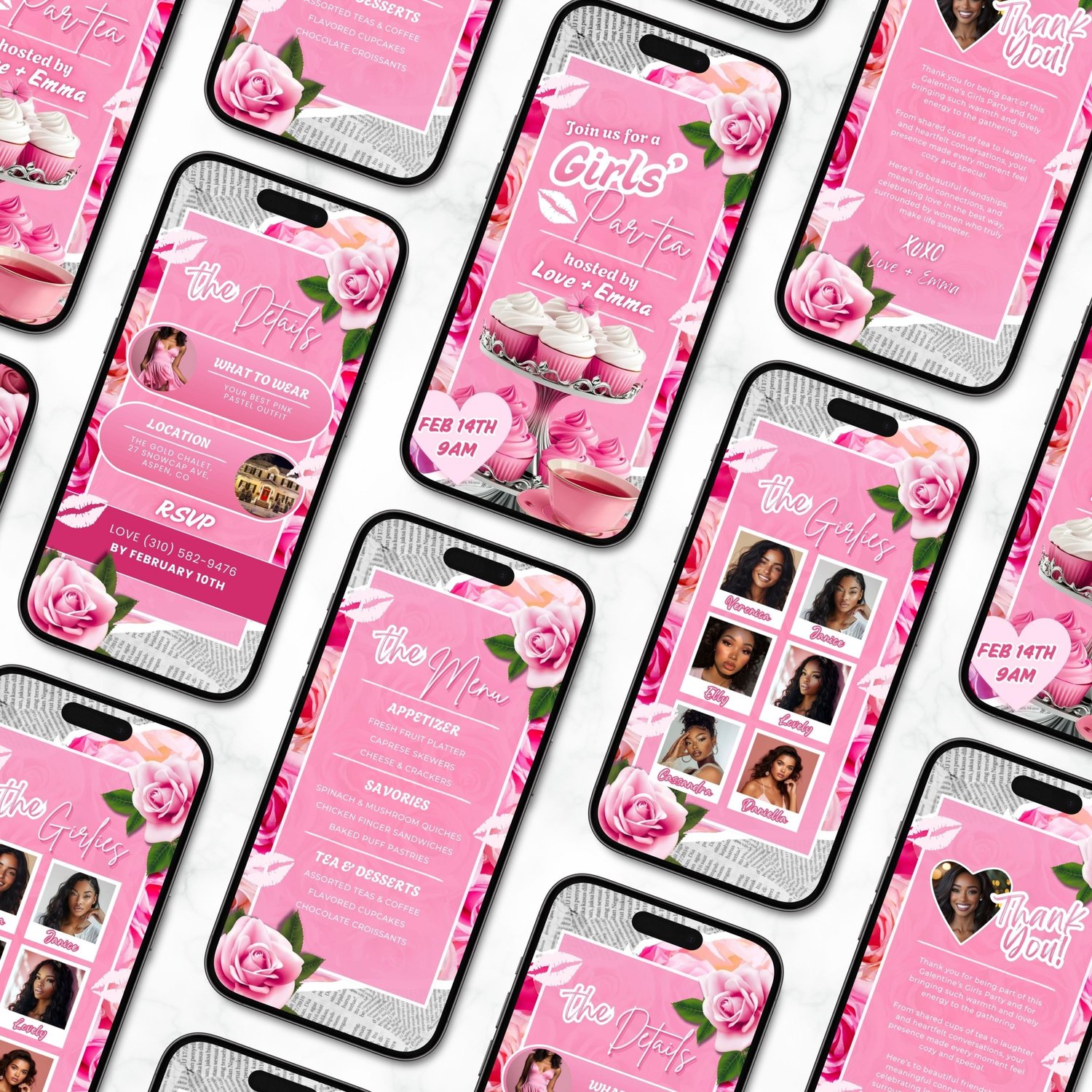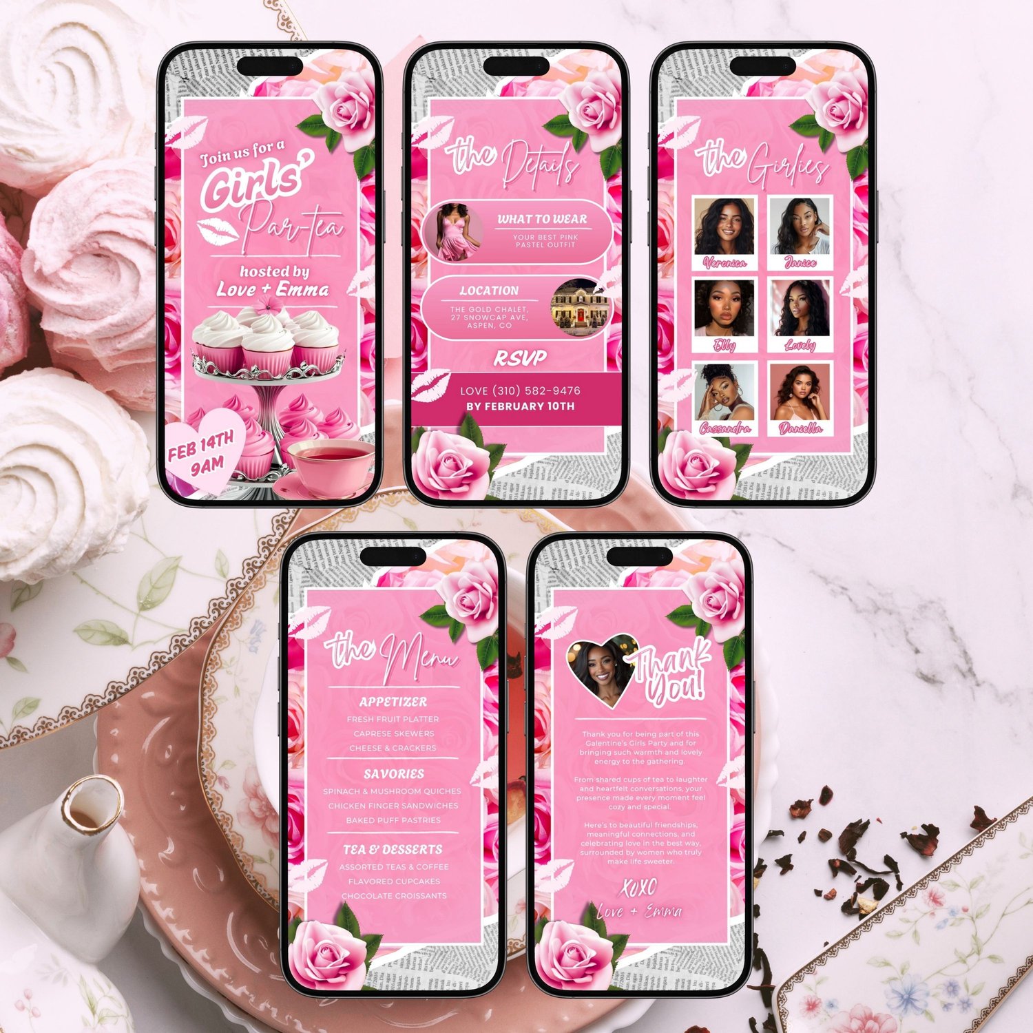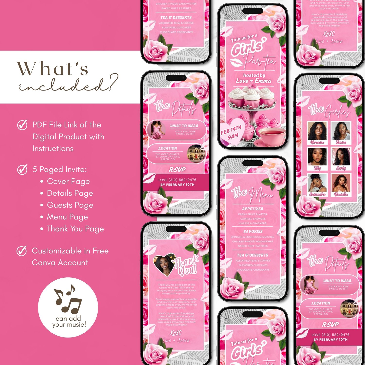 💗 Pink Girls Tea Party for Valentines Invitation, Invite for Galentines Par-tea Brunch w/ Cupcake & Pink Roses | 5 Pages | Animated Canva Video Template 💗