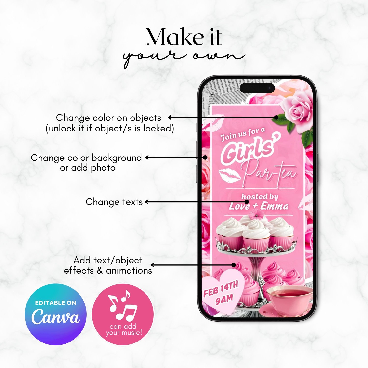 This animated Canva video invitation is fully editable and mobile-friendly, making it easy to customize and share in just minutes. Whether you’re planning a Galentine’s brunch, Valentine’s tea party, or pastel girls gathering, this invite sets the tone with warmth, sweetness, and style.