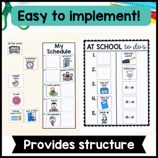 A visual schedule communicates upcoming activities and tasks using pictures, giving students a clear roadmap of the day. They:
