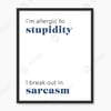 This humorous photo tile features the witty phrase "I'm allergic to stupidity; I break out in sarcasm," making it a perfect addition to any space that appreciates a touch of humor.