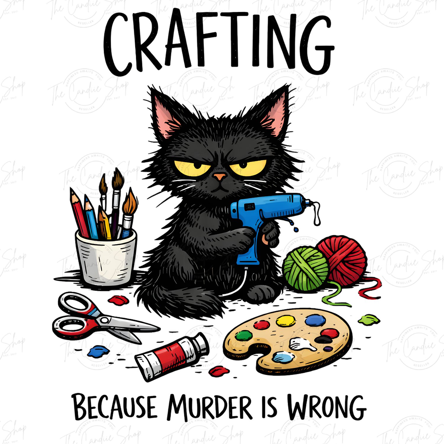 Add a little dark humor to your craft projects with this funny crafting cat PNG design! This digital artwork features a grumpy black cat holding a hot glue gun surrounded by craft supplies, paired with the sarcastic quote: “Crafting because murder is wrong.”