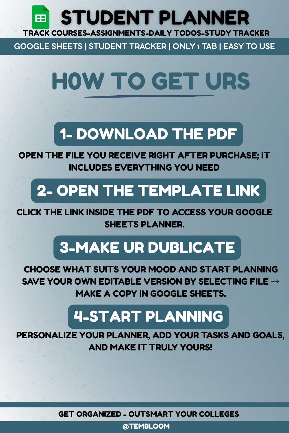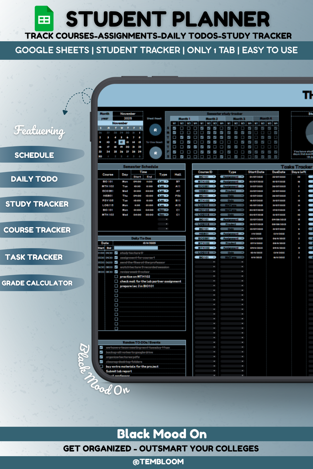 Take full control of your academic journey with this all-in-one Google Sheets student planner, designed to keep everything in one place — from your daily tasks to your semester-long goals. With a smart layout and visually engaging progress trackers, managing your courses, deadlines, and grades has never been easier (or more satisfying!).