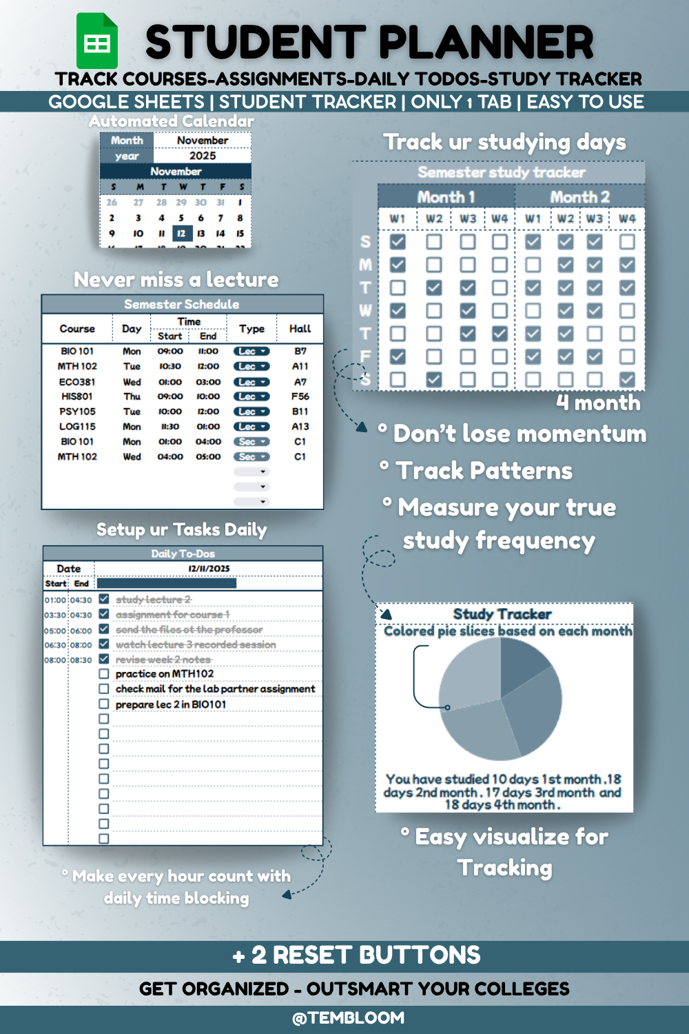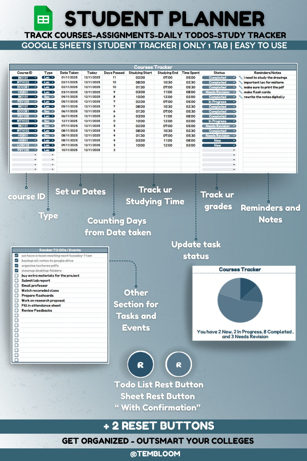 ✅ Two Reset Buttons – Clear your sheet in one click and reuse it every semester, clear your daily and random To-Dos separately and reuse them every day with ease separately