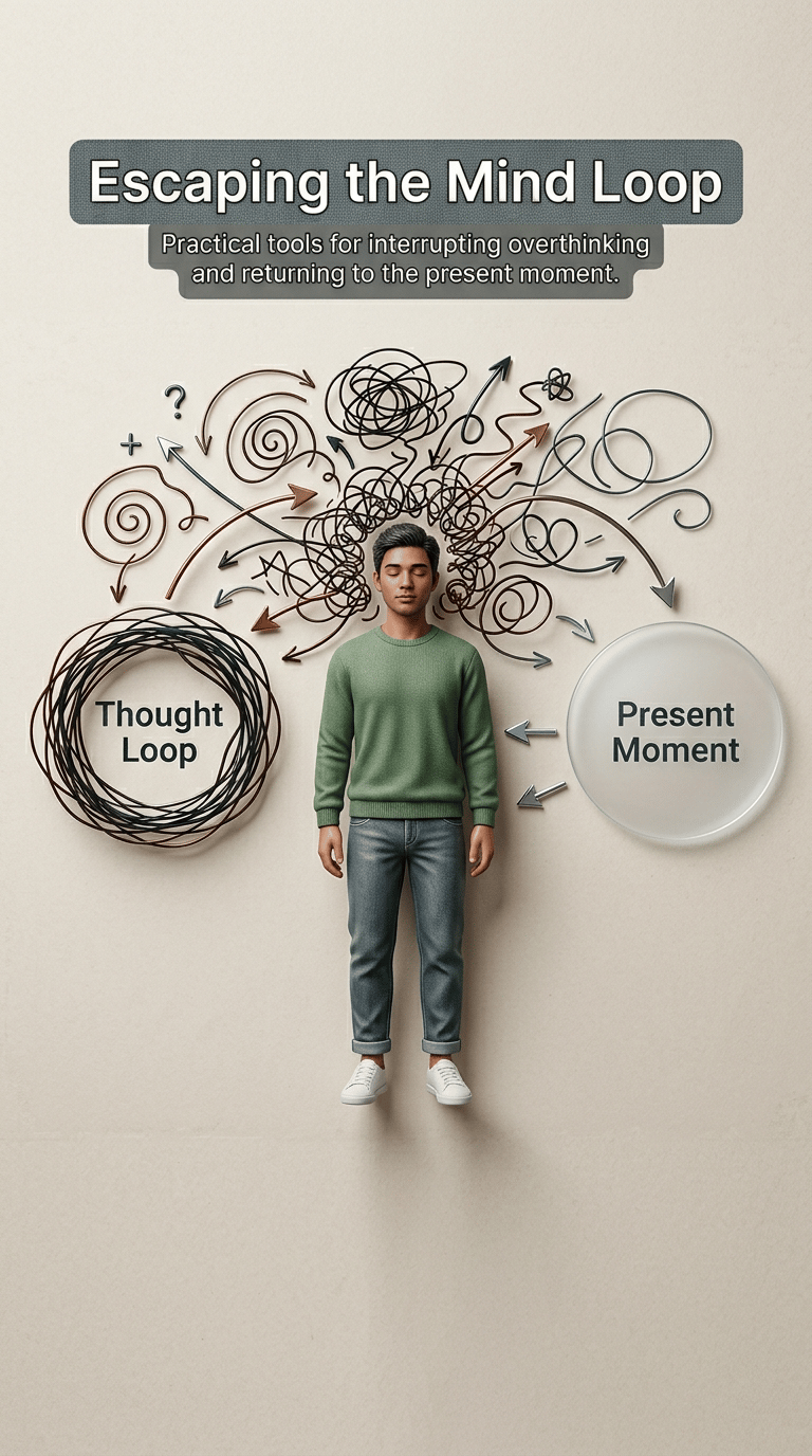 Escaping the Mind Loop is a practical Application Guide designed to help you interrupt repetitive thinking and return your attention to the present moment.