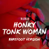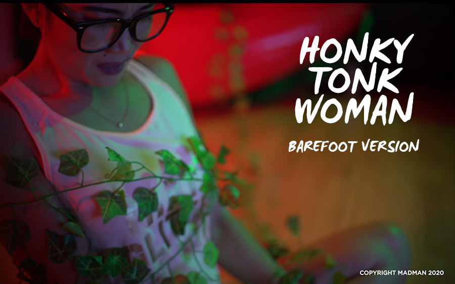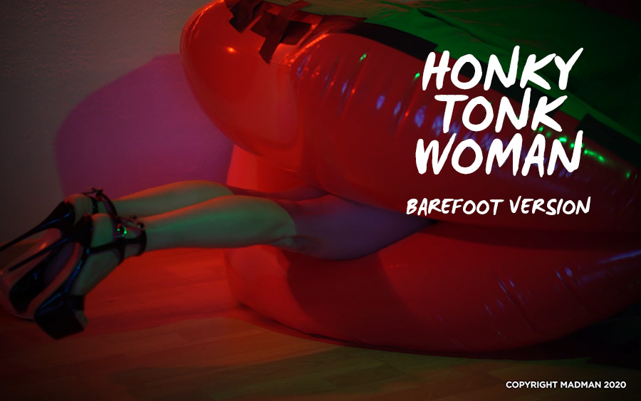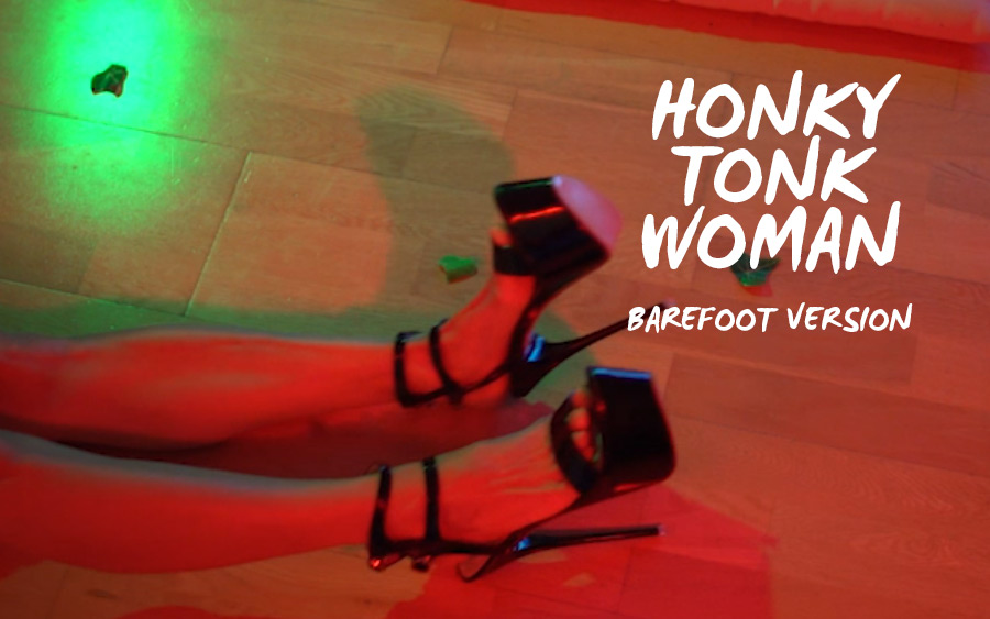 Audrey is wearing black vinyl shorts, pink top, black high heels, and bare feet.