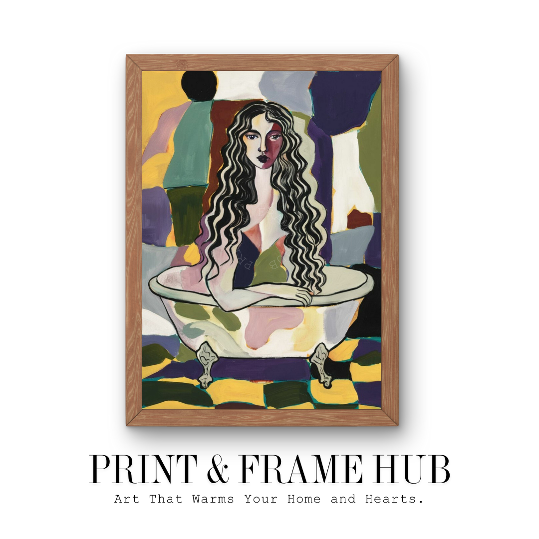This vibrant painting features a woman with wavy hair in a bathtub, set against a geometric background in deep hues. The bold, abstract style and harmonious colors make it a standout piece for any wall.