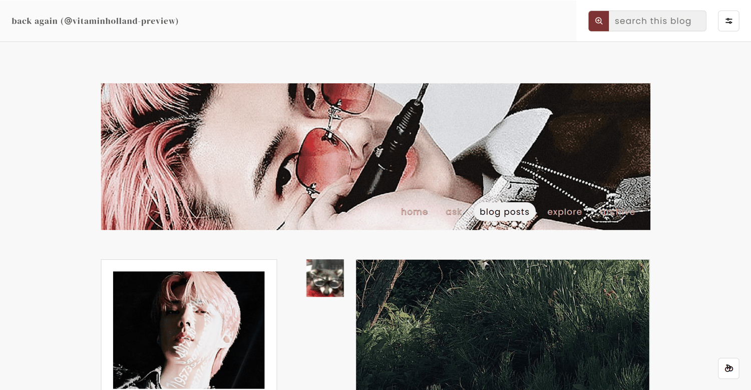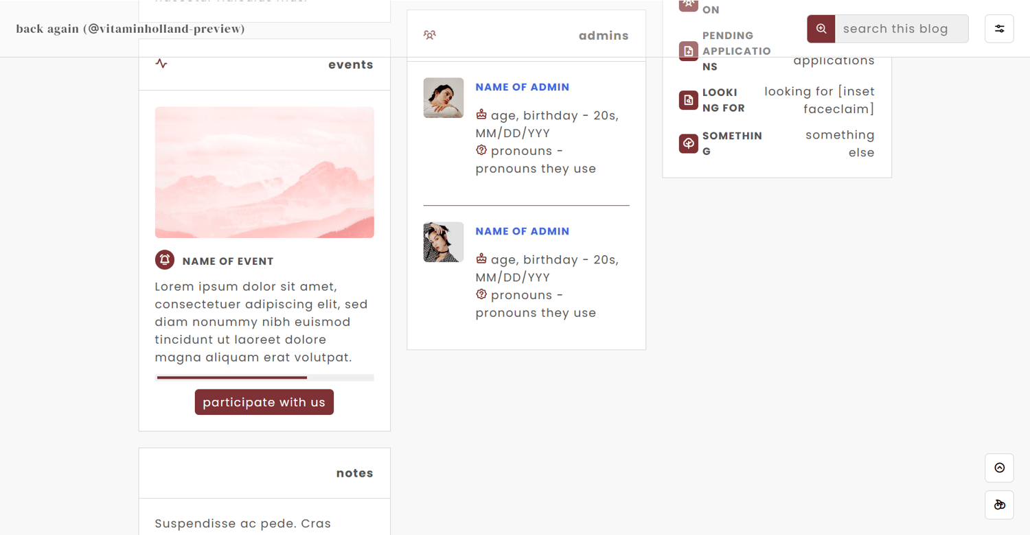 features: 936x250px header image, 258x200px sidebar image, 70x70px icon image, blog title, blog subtitle, five custom links, tab 2**: about section, wid & tasks section, extra links section, events section, admin section, blog info section, more notes section, 500px text posts