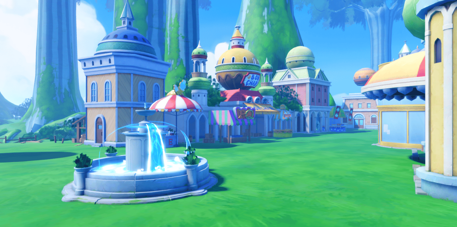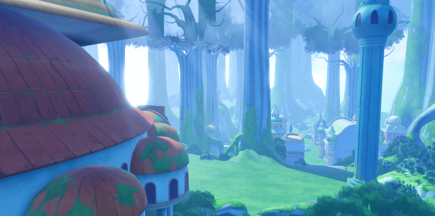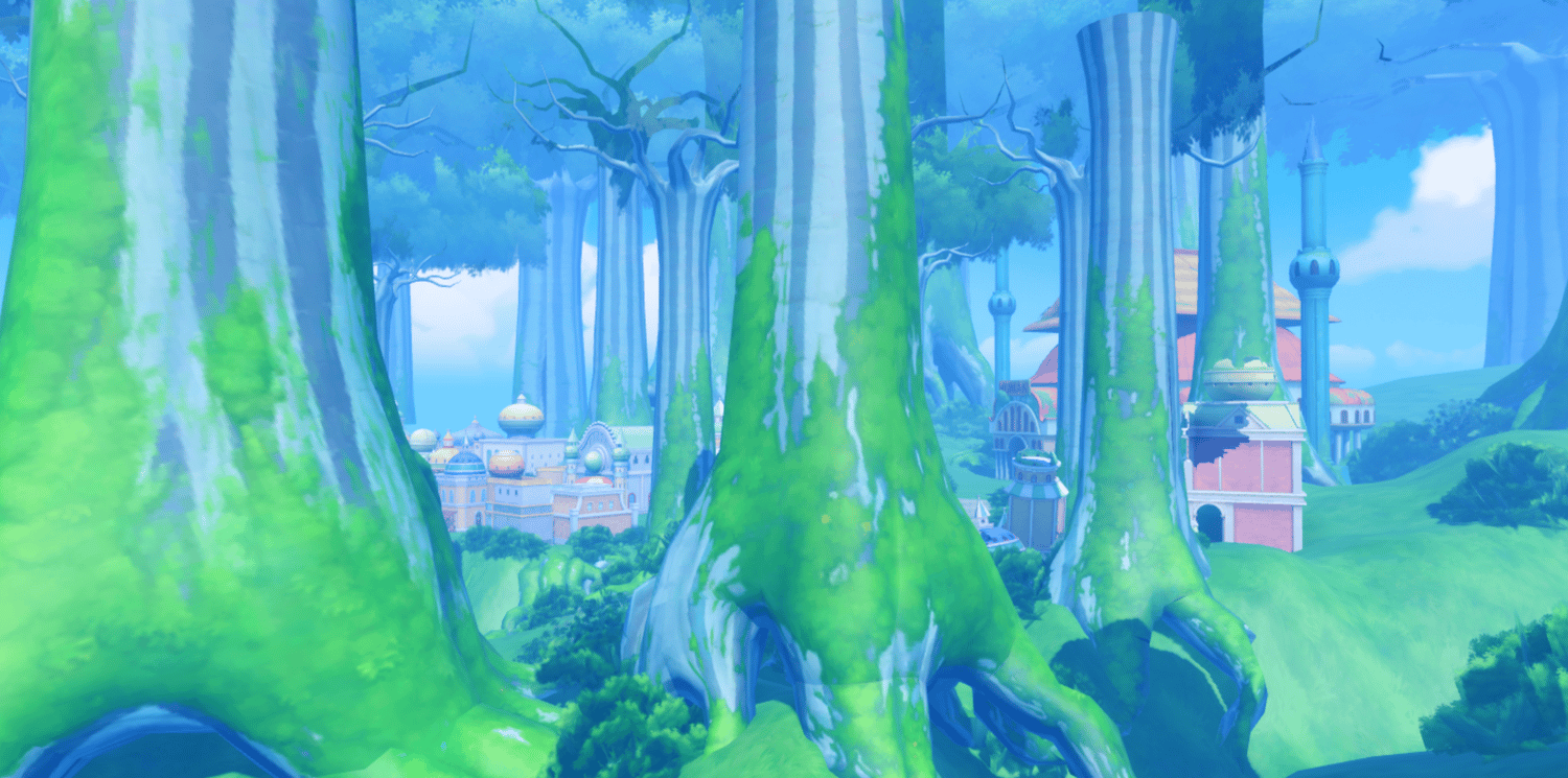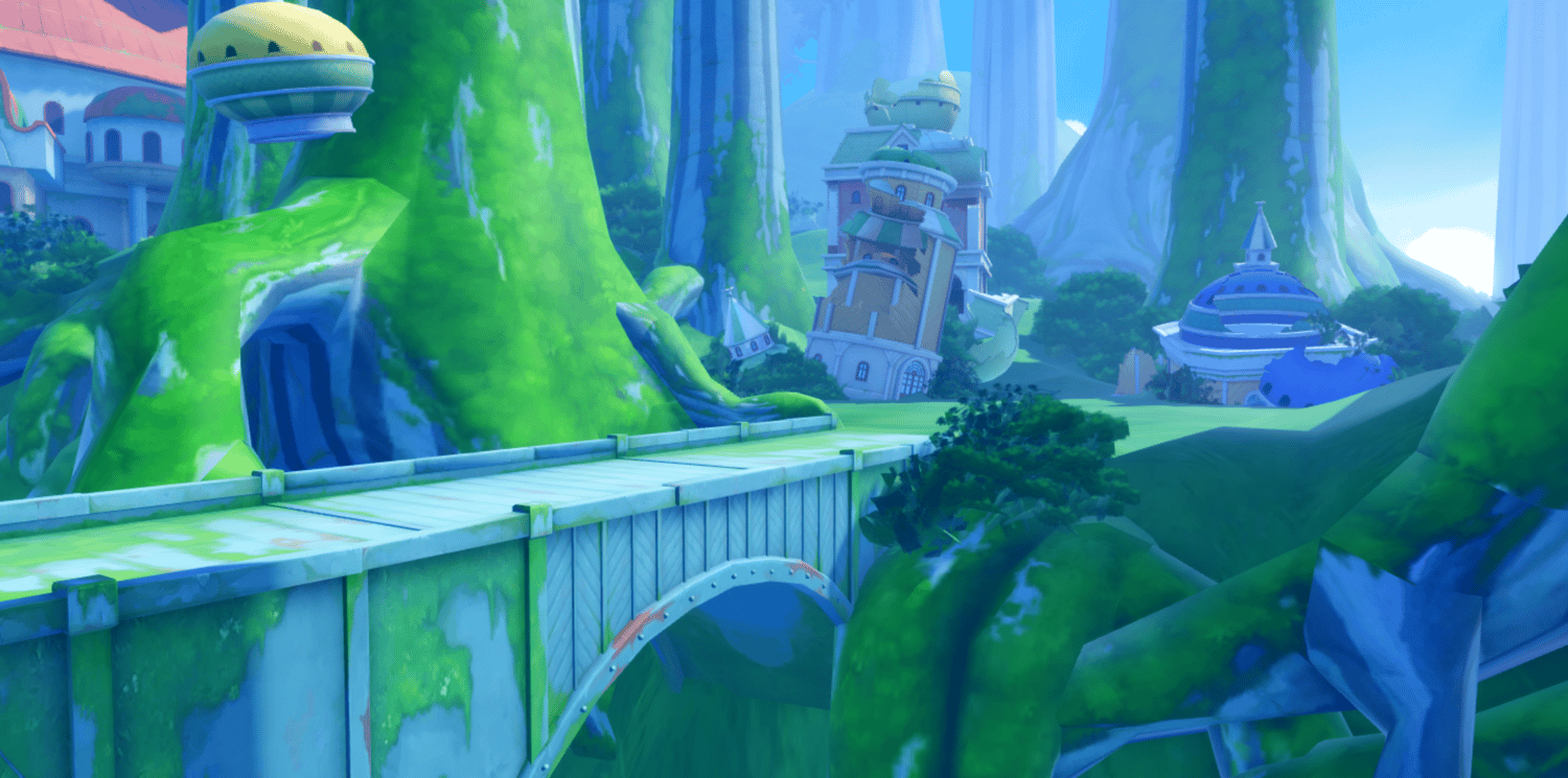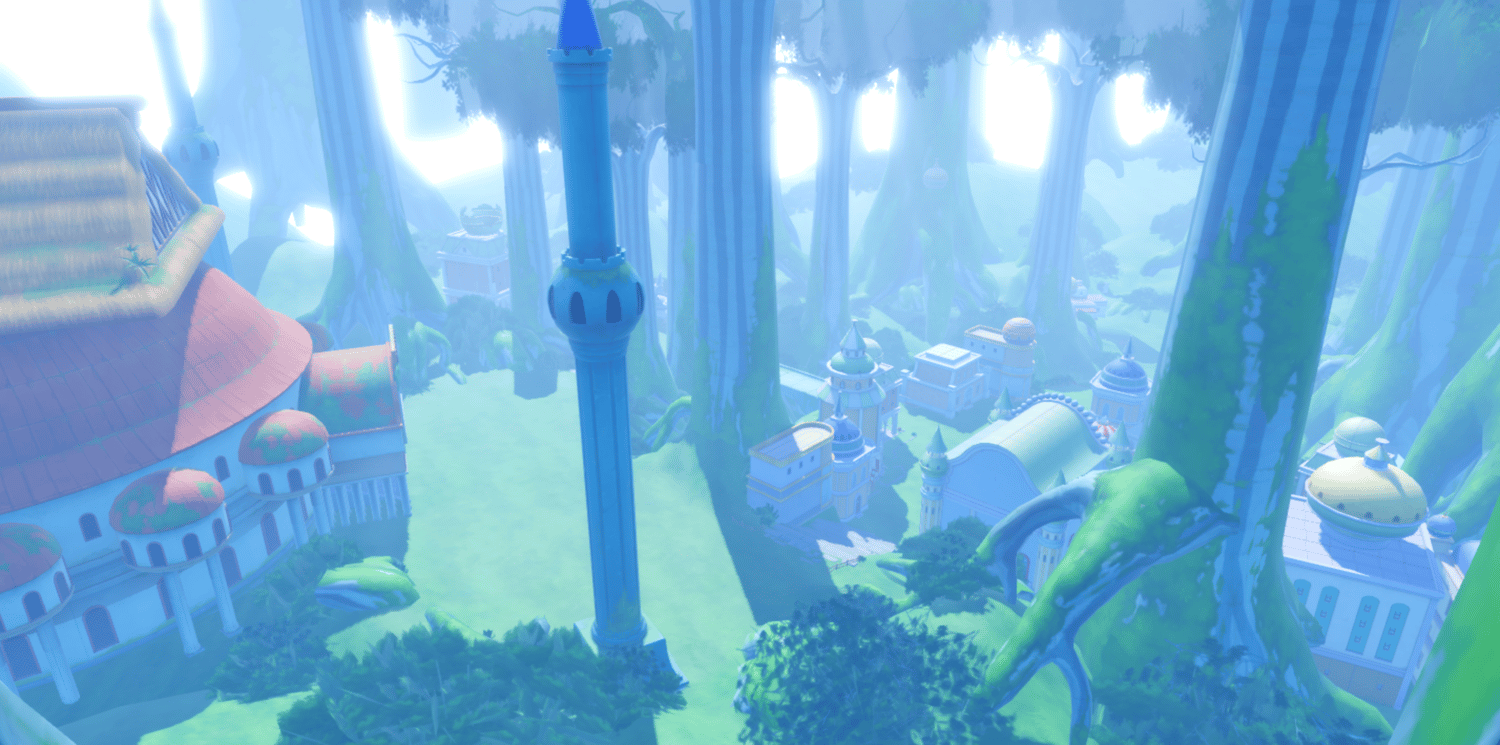 A whimsical anime-inspired archipelago recreating Sabaody from One Piece, featuring massive towering mangrove trees, colorful pastel buildings with golden domes, and lush green landscapes. Stone bridges connect elevated plazas adorned with fountains, carnival banners, and fairytale-style architecture in soft pinks, yellows, and creams. Atmospheric mist filters through the giant tree trunks while bright saturated lighting creates a magical, adventurous tone. The layout supports seamless exploration across open lawns, shaded forest paths, and bustling town areas. Perfect for One Piece fan games, anime RPGs, fantasy adventures, hub worlds, or cinematic showcases.