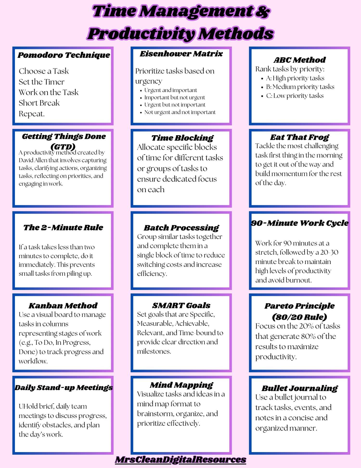 Unlock your full potential and take charge of your time with our Ultimate Time Management and Productivity Methods Printable. Get started today and experience the transformation in how you manage your day!