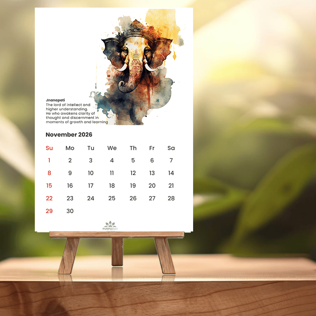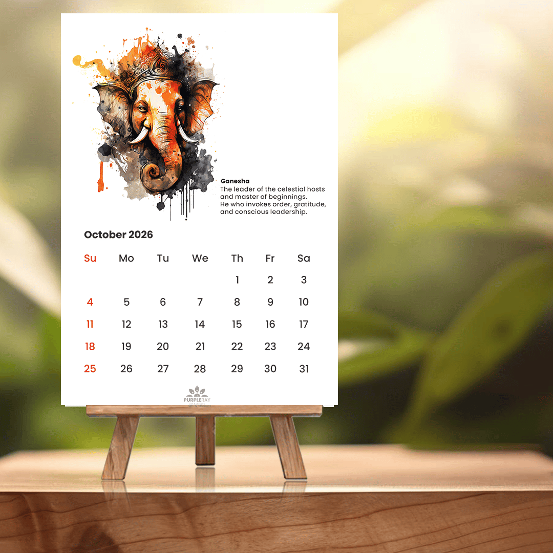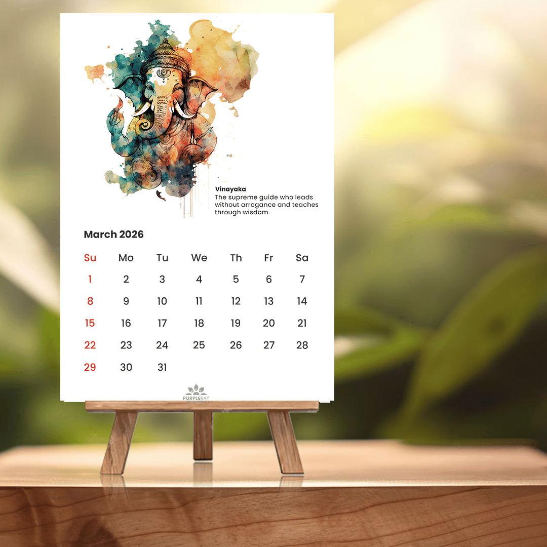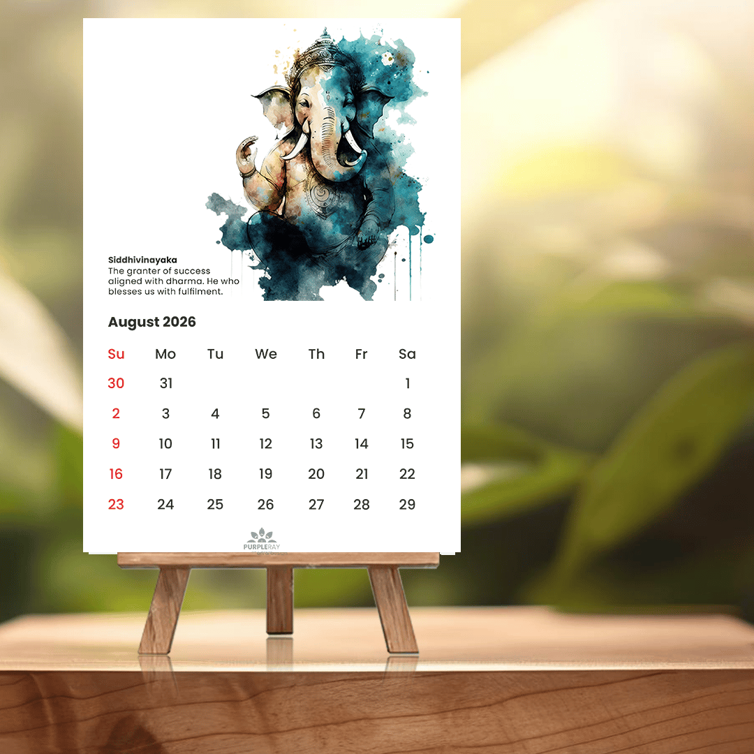 Bring auspicious energy into your year with this elegant A4 Lord Ganesha Art Calendar. Featuring 12 original Ganesha paintings, each inspired by a unique form and name, it beautifully blends devotion and art.