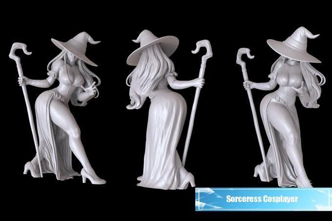 High-quality 3D printable figure of a female cosplayer inspired by the Sorceress character from the video game Dragon’s Crown.