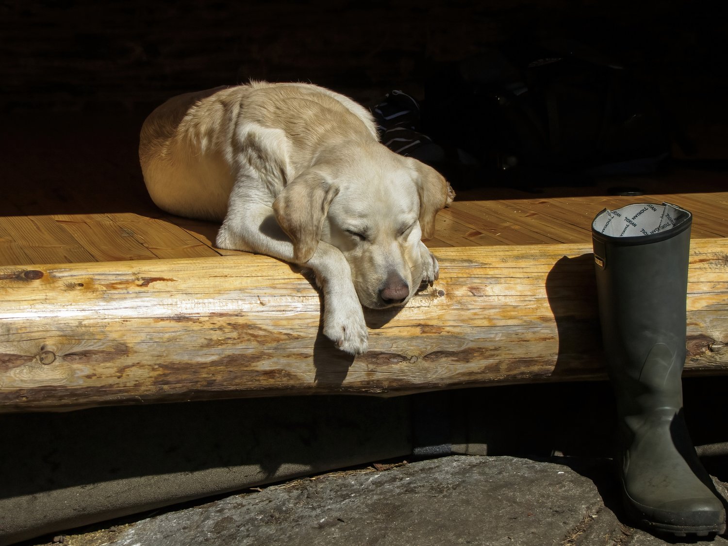 Labrador retriever Teppo is on a forest trip. When the sun is shining, it's good to rest a little in the camp.
