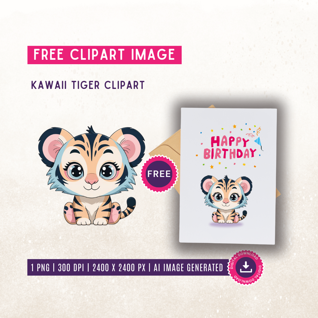 Bring some cuteness to your designs with this free kawaii tiger clipart. With big eyes, soft colours and an adorable expression, it’s perfect for planners, stickers, digital scrapbooking, invitations, or social media graphics.