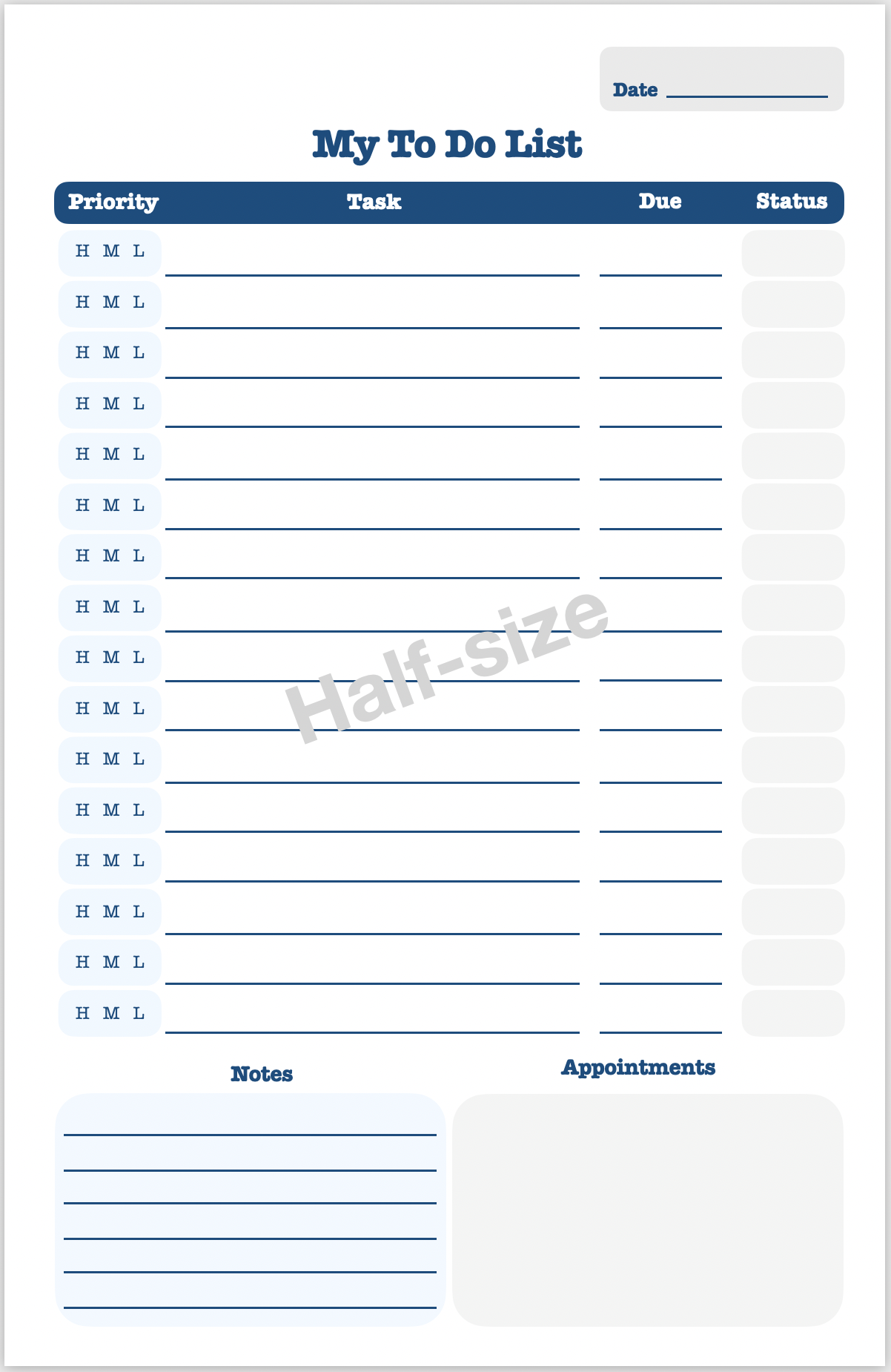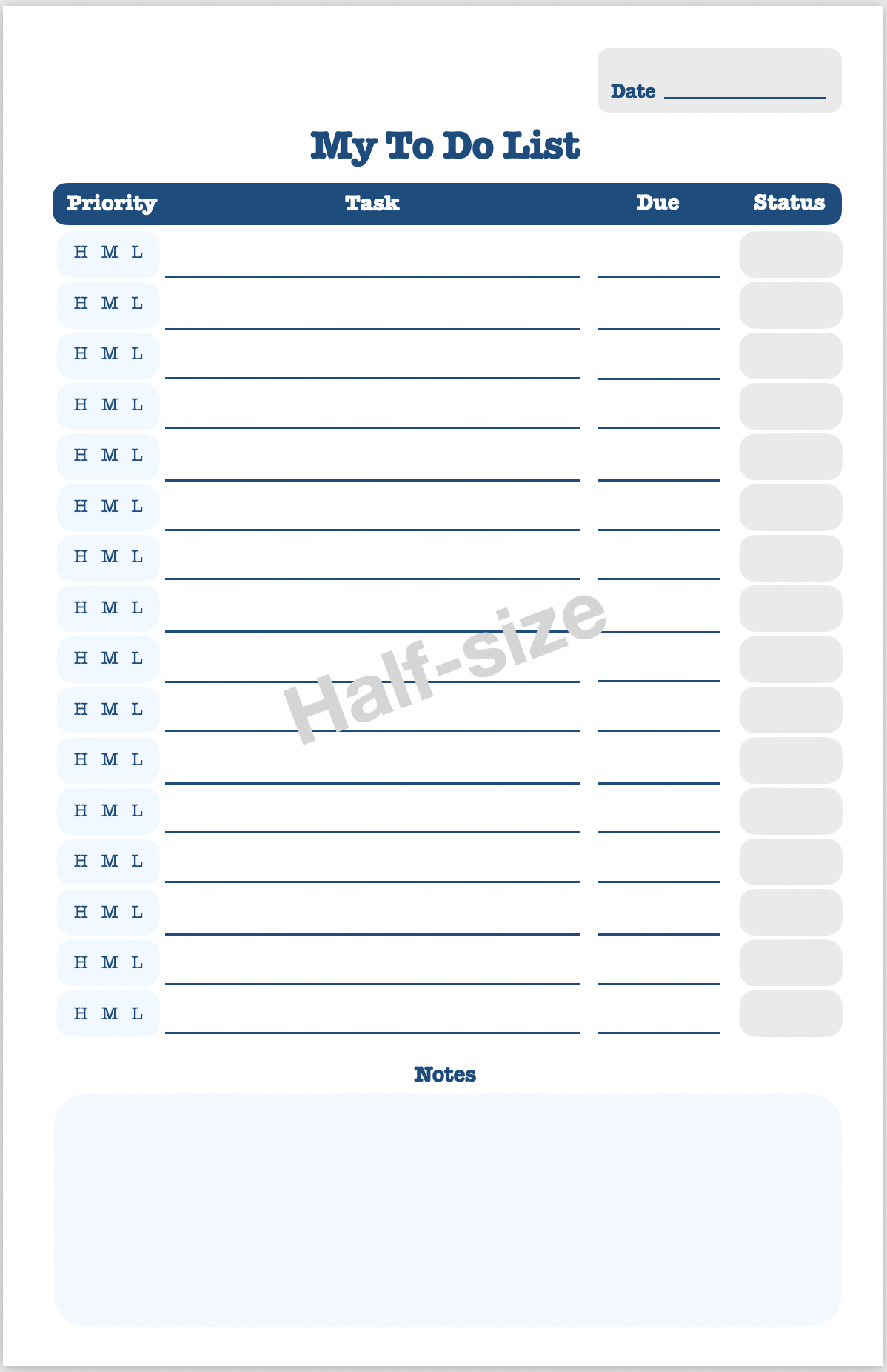 The half-size My To Do List is half the dimensions of a standard letter-size sheet, which is convenient for using on a smaller iPad or tablet.