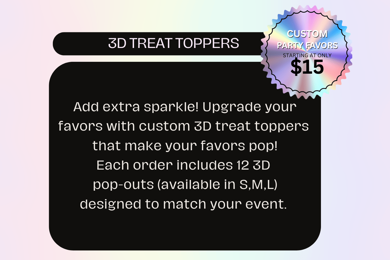 Take your party favors to the next level with our custom 3D Treat Toppers! Available in small, medium, and large sizes, these glam add-ons bring your theme to life with layered designs that pop. Perfect for character accents, logos, or stylish graphics. See the magic for yourself! 3D Pop-Out Examples