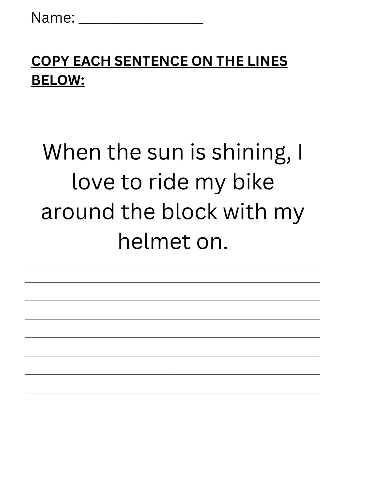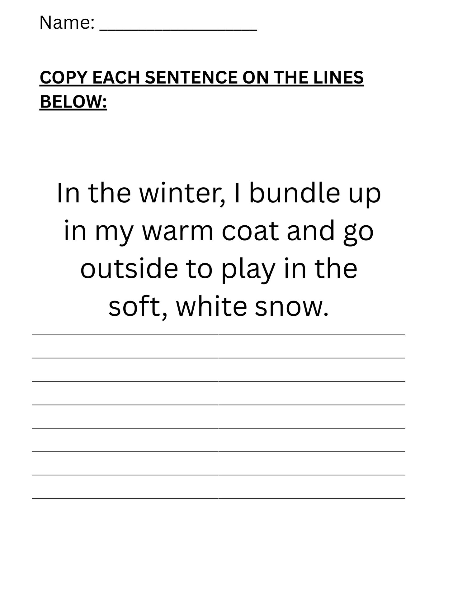 This 20-page copying exercise is designed for children aged 3 to 7 to help develop their handwriting, fine motor skills, and attention to detail. Each page features simple, fun, and engaging sentences with familiar words and colorful themes that capture a child’s interest. The exercises gradually build confidence, improve letter formation, and encourage early reading skills, making learning both enjoyable and effective. Perfect for home practice or classroom use, this set gives young learners plenty of opportunities to practice writing while having fun.